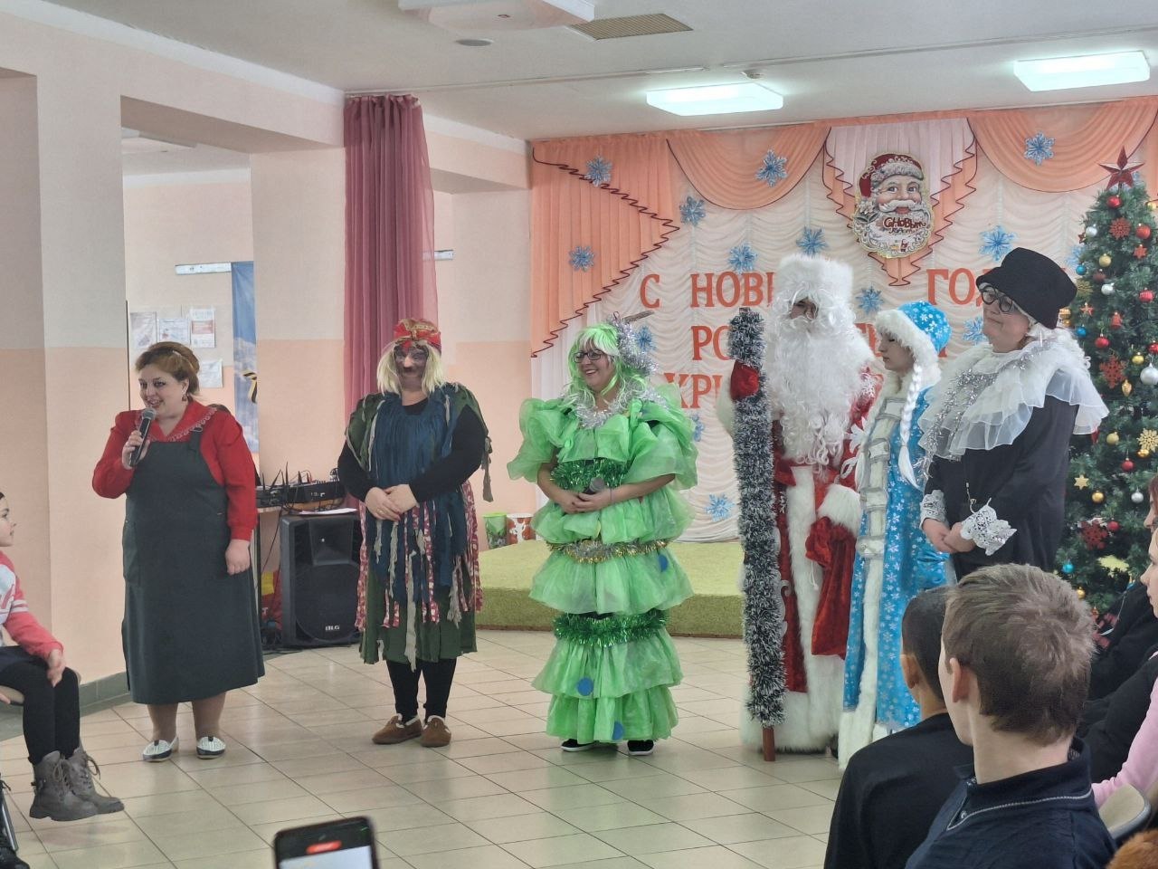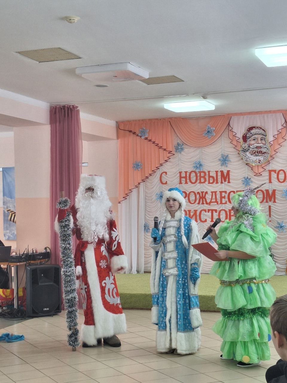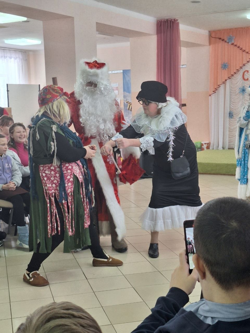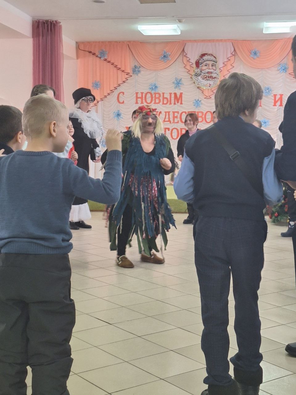Озорные Шапокляк и Баба Яга вовлекли ребят в калейдоскоп новогодних приключений, конкурсов, игр и музыкальных забав. Кульминацией торжества стало появление долгожданных Деда Мороза и Снегурочки.