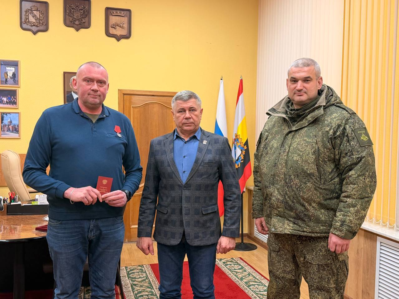 Глава Обоянского района Игорь Глущенко и военный комиссар Обоянского района Илья Попов передали награду Денису Ивановичу.