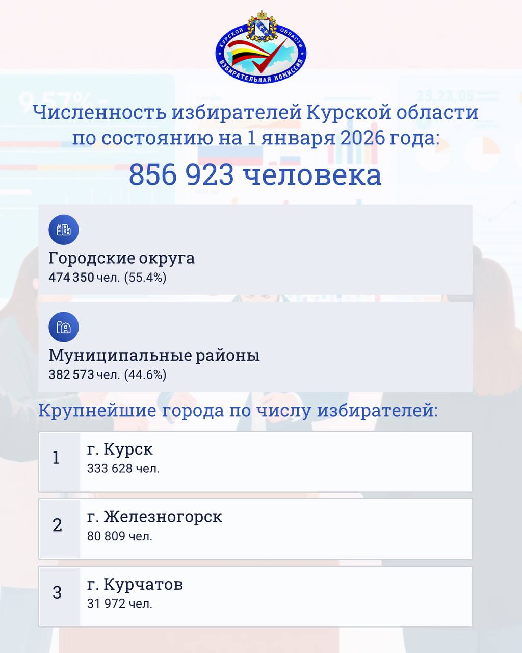 Общая численность избирателей Курской области составляет 856 923 человека.