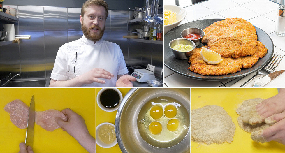 В московском кафе израильской кухни DIZENGOF 99 этот популярный куриный шницель готовят в больших объемах — около 1000 штук в месяц, подавая его с лимоном и картофельным пюре. Шеф-повар Константин Борисов поделился секретами приготовления идеального куриного шницеля. Вот ключевые моменты, которые были озвучены в видео-мастер-классе.