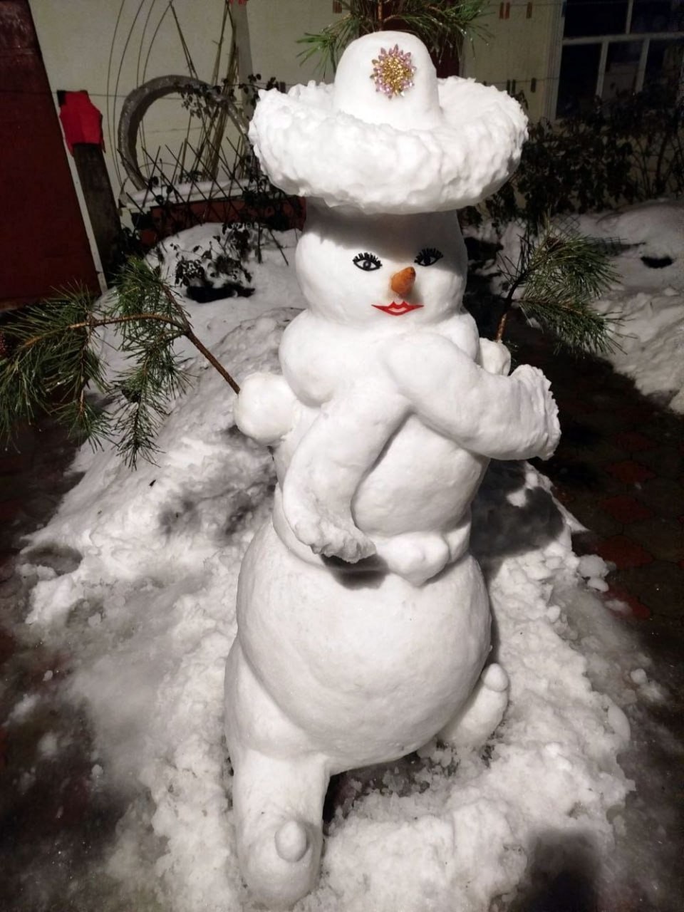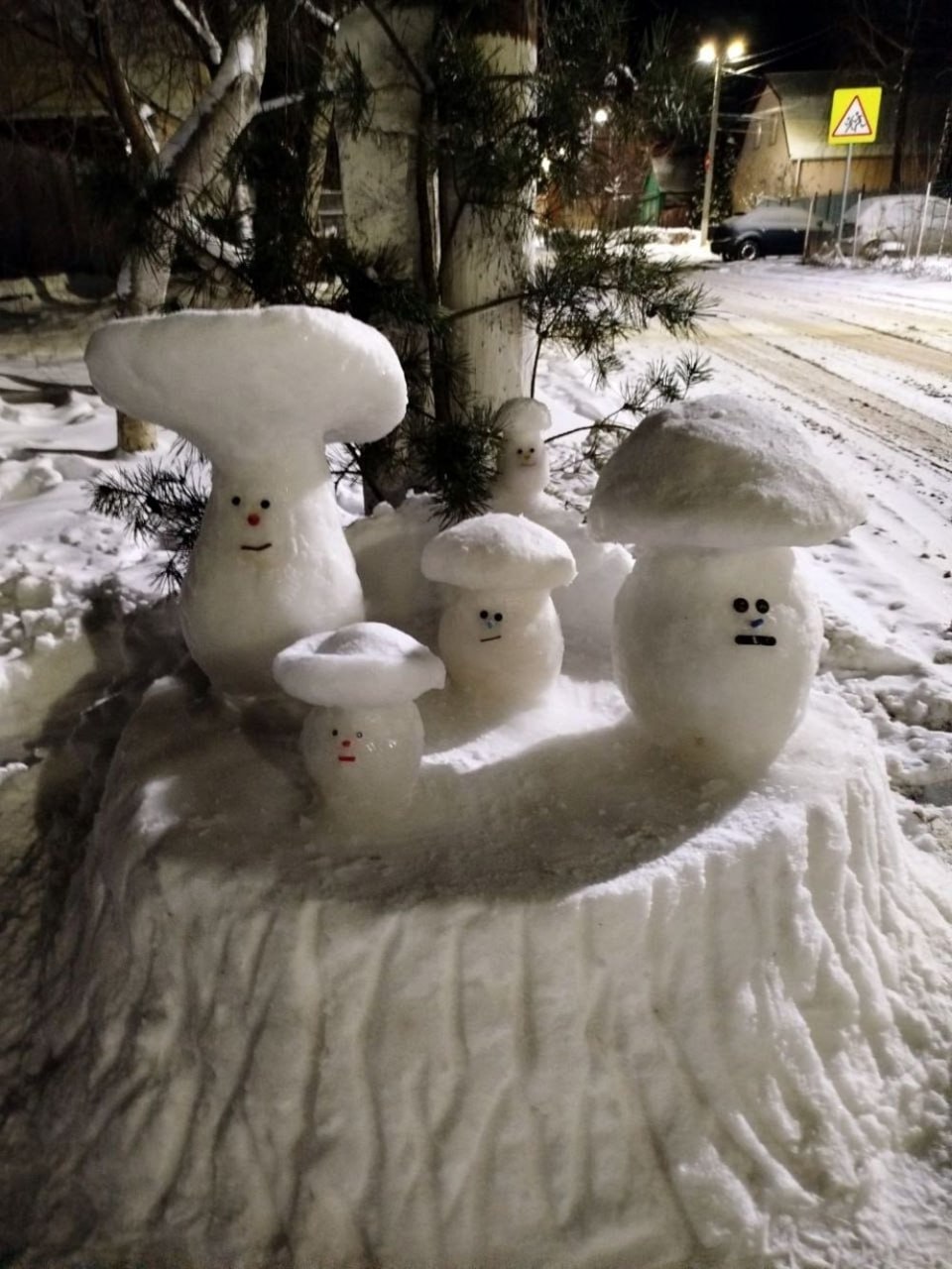 Сергей Гонохов из Фатежа каждую зиму, при подходящей погоде, лепит снежные скульптуры на придомовой территории. В этом году во дворе появились грибная семейка, Снежная королева и заяц.