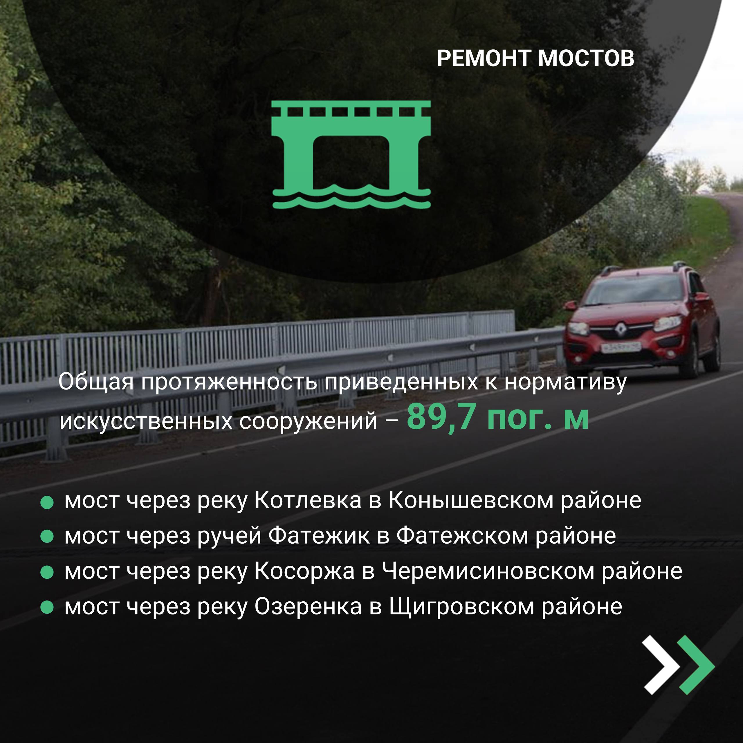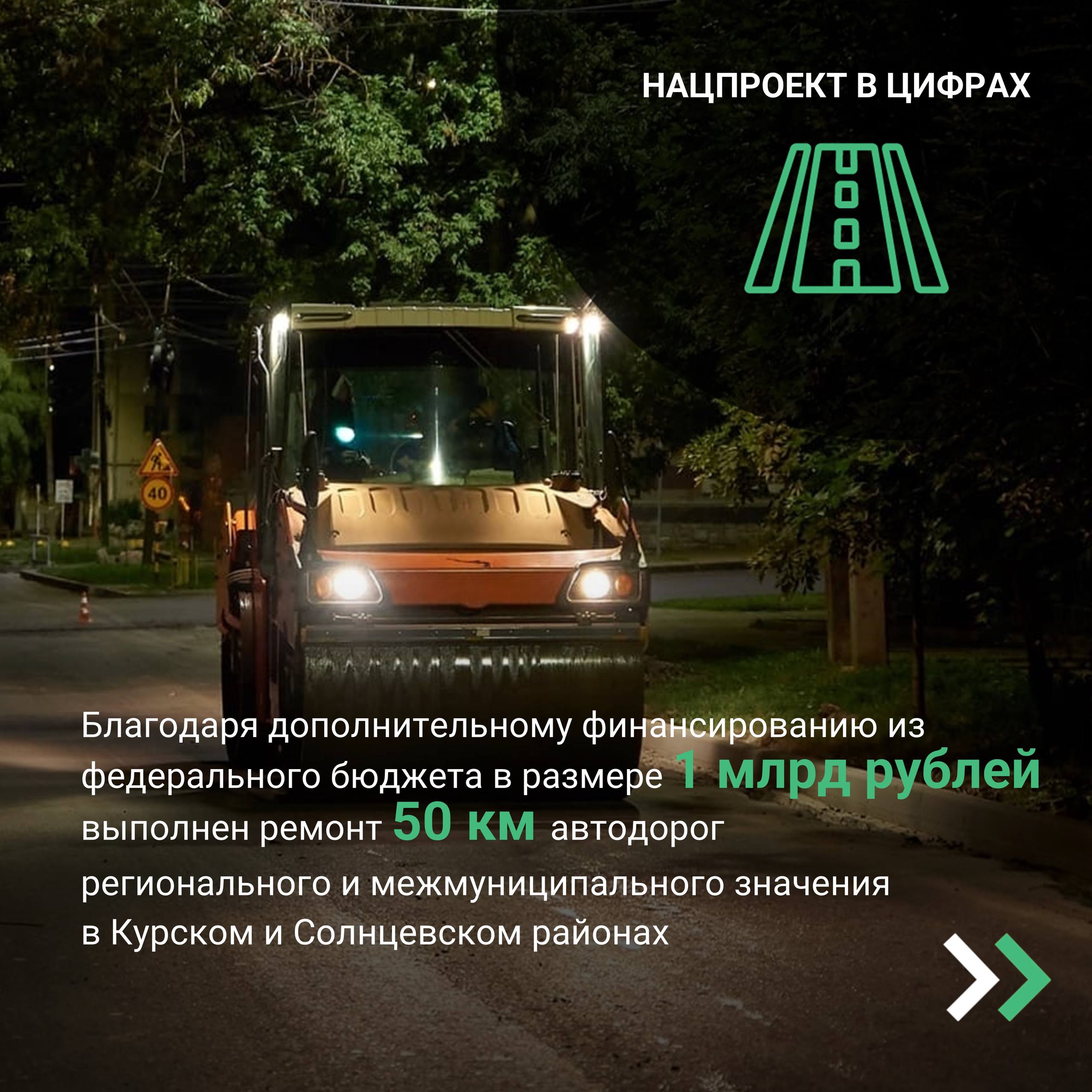 Благодаря национальному проекту «Инфраструктура для жизни» в прошлом году в Курской области привели в нормативное состояние более 222 км автомобильных дорог регионального и межмуниципального значения, отремонтировали 4 моста. Работы прошли в 16 районах.
