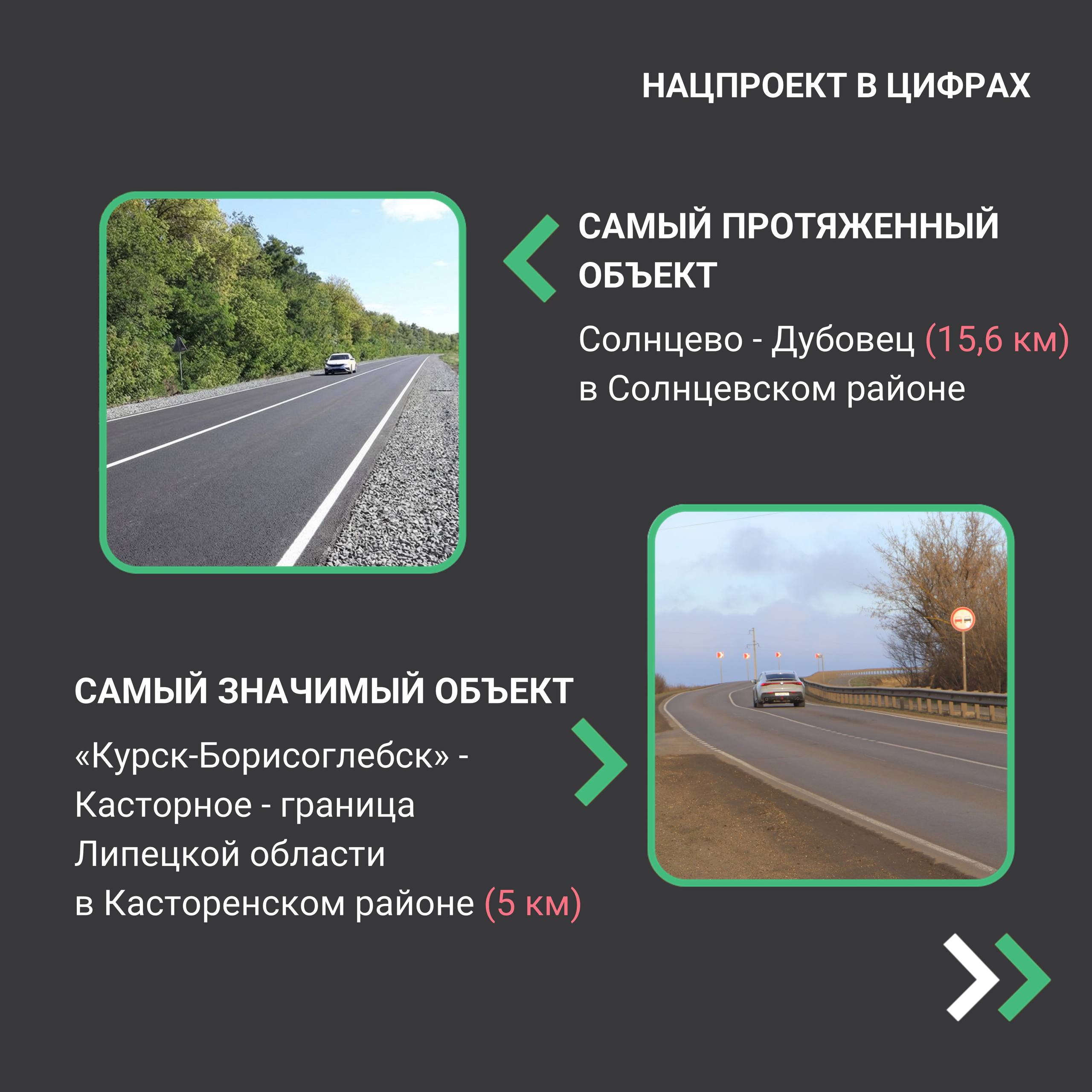 Другим важным объектом стал 5-километровый участок дороги в Касторенском районе. Трасса связывает два района и обеспечивает подъезд к нескольким населенным пунктам и крупному маслоэкстракционному заводу.