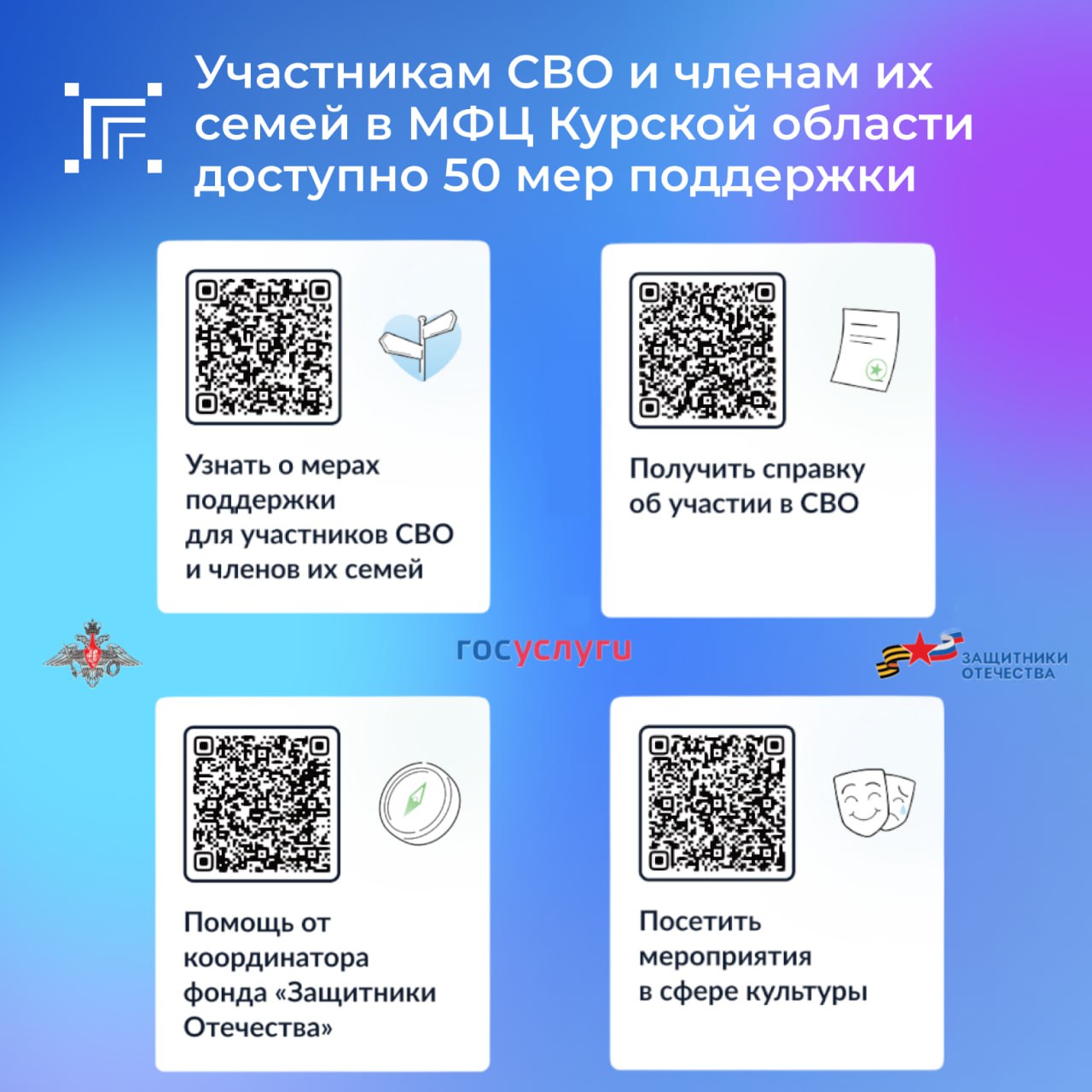 Узнать подробнее о мерах поддержки и получить их защитники Отечества могут в МФЦ Курской области. Сейчас в многофункциональном центре для участников СВО и членов их семей доступно 50 мер поддержки, как в окнах обслуживания, так и в секторах пользовательского сопровождения.