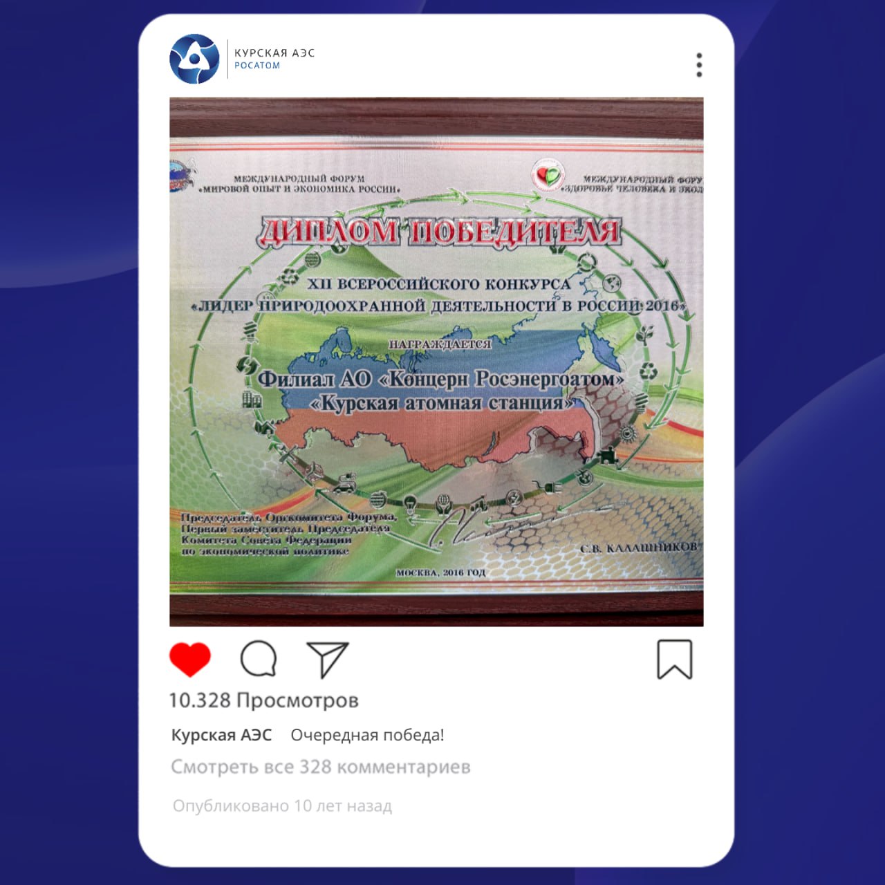 Курская АЭС стала победителем VII Всероссийского конкурса «Лидер природоохранной деятельности России—2016».