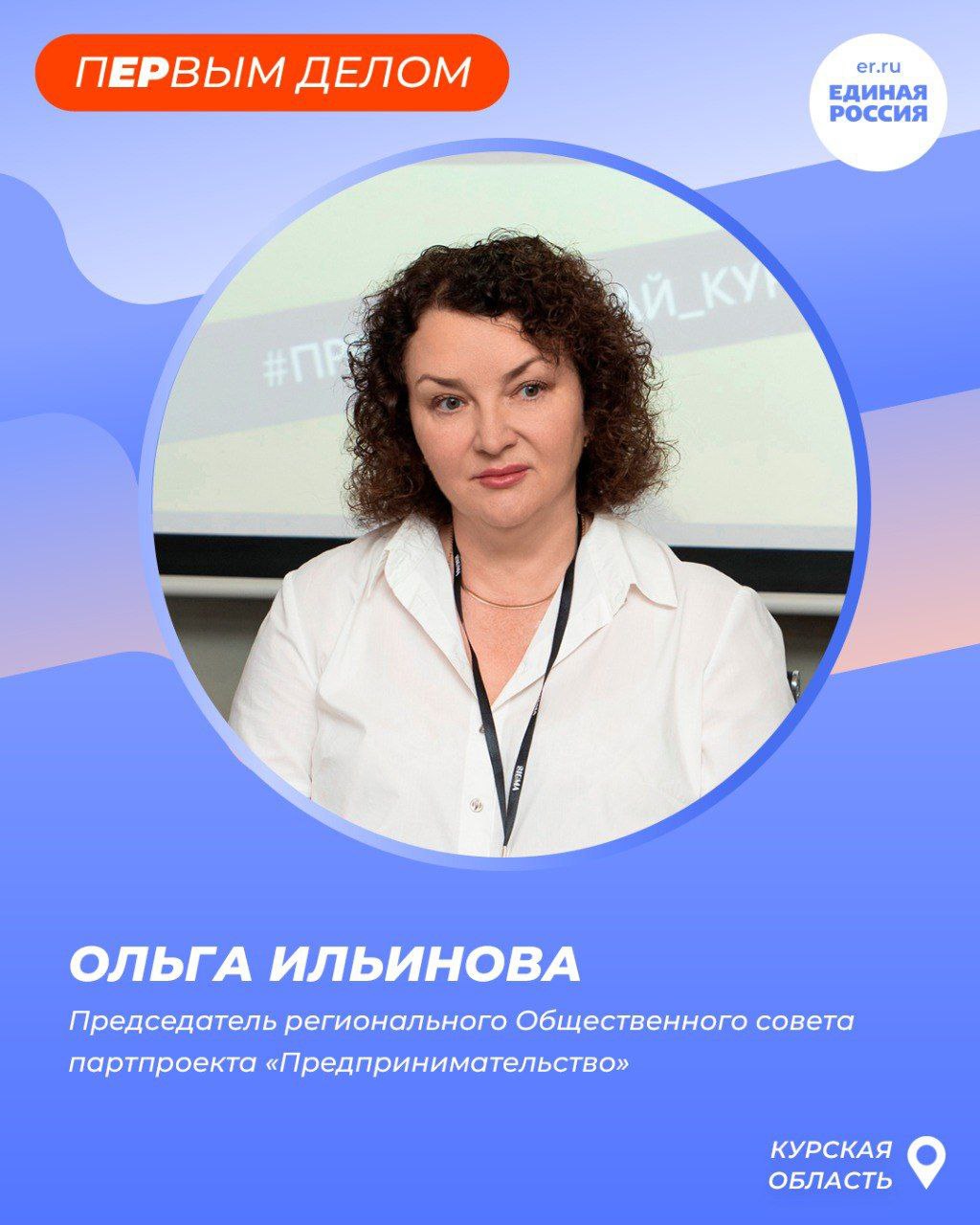 В России зарегистрировано более 6,5 млн субъектов малого и среднего предпринимательства. Они обеспечивают работу более 30 миллионов человек, что примерно 40% работающего населения. Качественный рост малого и среднего бизнеса, деловой климат, а также уверенность в завтрашнем дне их работников является одним из важнейших приоритетов Народной программы «Единой России». Председатель Общественного совета партпроекта в Курской области является Ольга Ильинова.