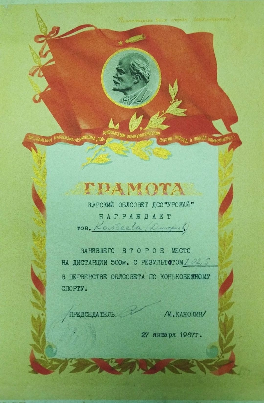 "Дмитриевские конькобежцы" нынче звучит как "сомалийские космонавты". Но перед нами фото исторического документа 1967 года. Представитель Дмитриевского района Колбеев Николай Фёдорович выигрывает 2 место на дистанции 500 м на соревнованиях областного совета ДСО "Урожай" по конькобежному спорту в Курске. Грамота хранится в Дмитриевском краеведческом музее.