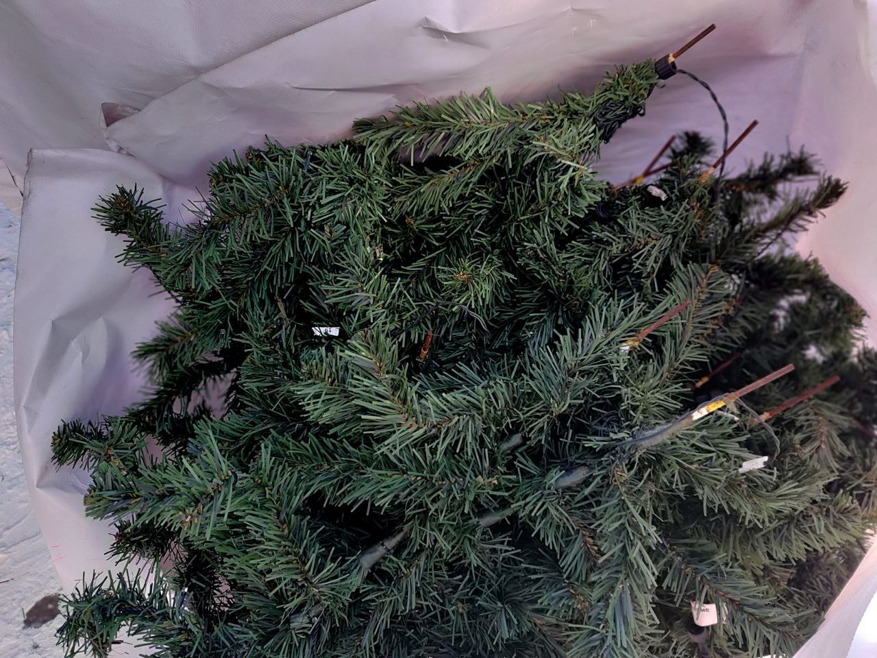 Рабочие аккуратно складывают веточки 17-метрового искусственного дерева в мешочки, чтобы позднее отвезти их на склад для хранения.