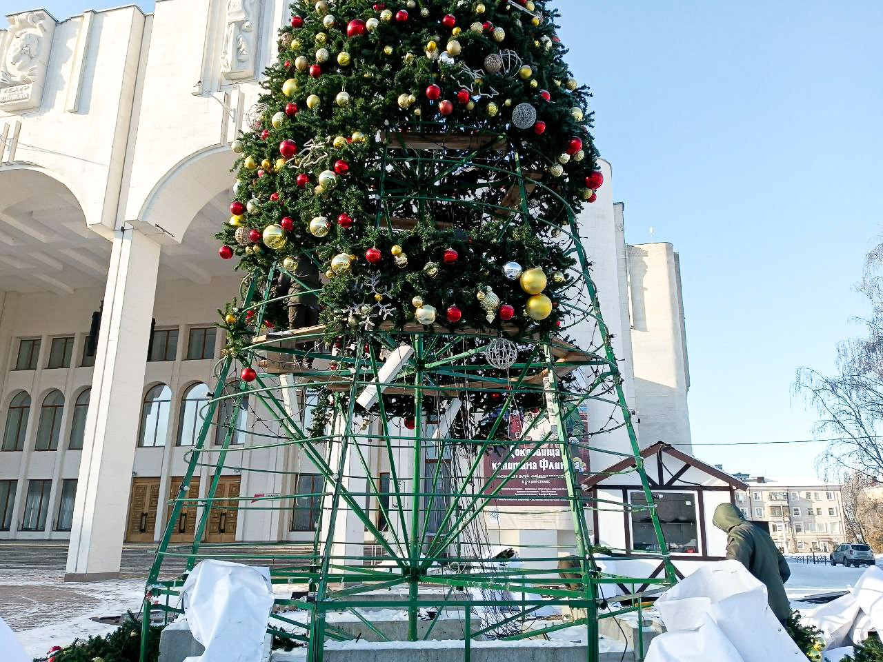 После праздников они приступили к демонтажу праздничной елки на Театральной площади.