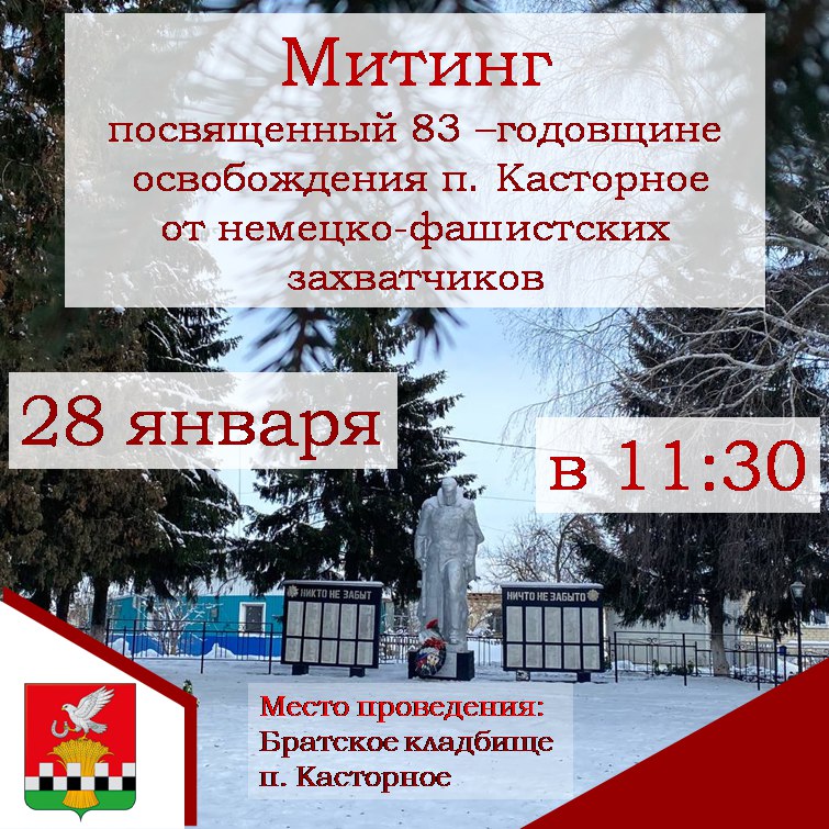 Завтра, 28 января 2026 года в 11 часов 30 минут приглашаем принять участие в торжественном митинге посвященном годовщине освобождения п. Касторное и Касторенского района от немецко-фашистских оккупантов, возложении венков и цветов к могилам погибших воинов.