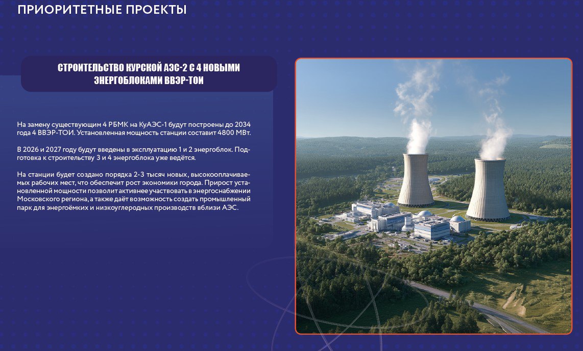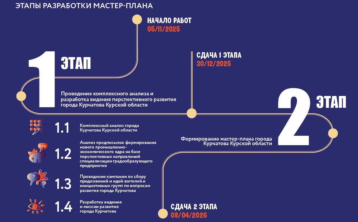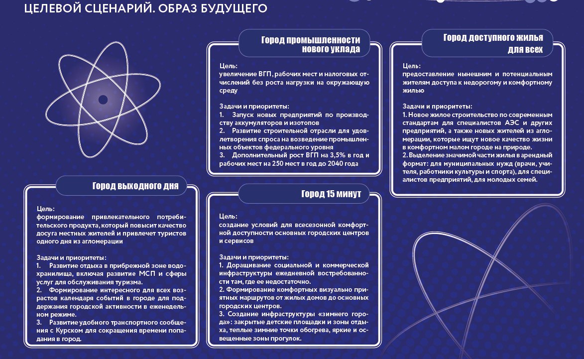 Первый этап концепции пространственного развития города включает в себя проведение комплексного анализа и разработку видения перспективного развития Курчатова. А на начало февраля запланировано заседание рабочей группы, в состав которой входят представители министерств Курской области, Госкорпорации «РОСАТОМ», Курской АЭС и администрации города Курчатова, на котором разработчики презентуют итоги проделанной работы.