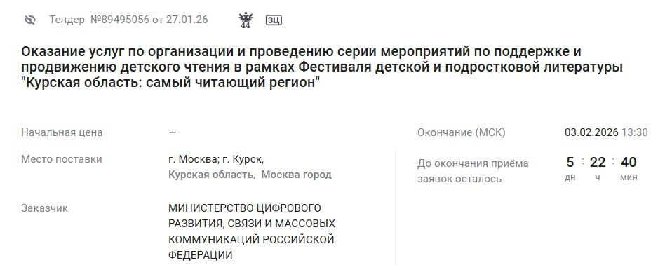 Министерство цифрового развития России объявило тендер на портале RosTender.info на организацию крупного культурного события — фестиваля детской и подростковой литературы «Курская область: самый читающий регион». В техническом задании к тендеру, с которым ознакомилось "КурскСити", детально прописана вся программа, однако общий бюджет проекта в тендере не раскрывается.