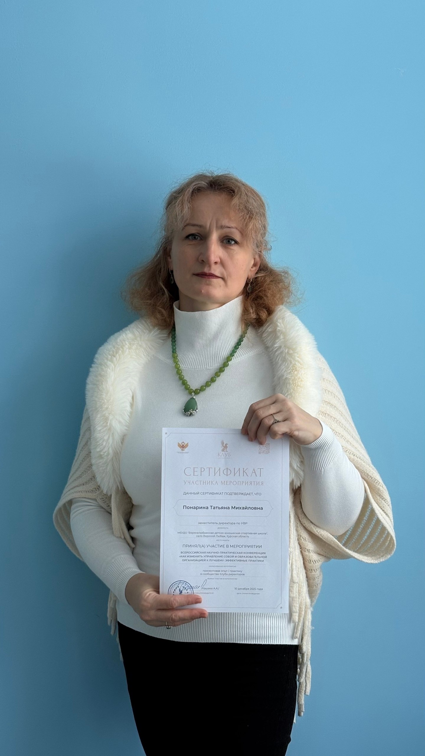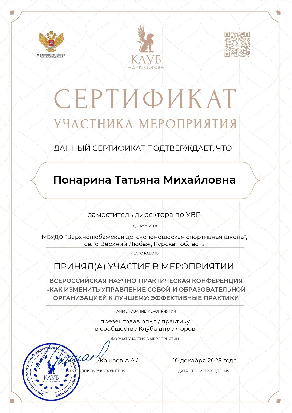 Заместитель директора по УВР в МБУ ДО "Верхнелюбажская ДЮСШ" Понарина Татьяна Михайловна приняла участие во Всероссийской научно-практической конференции «Как изменить управление собой и образовательной организацией к лучшему: эффективные практики». Направленный материал с описанием опыта/практики был рекомендован экспертами к представлению в сообществе «Клуба директоров» в рамках конференции.