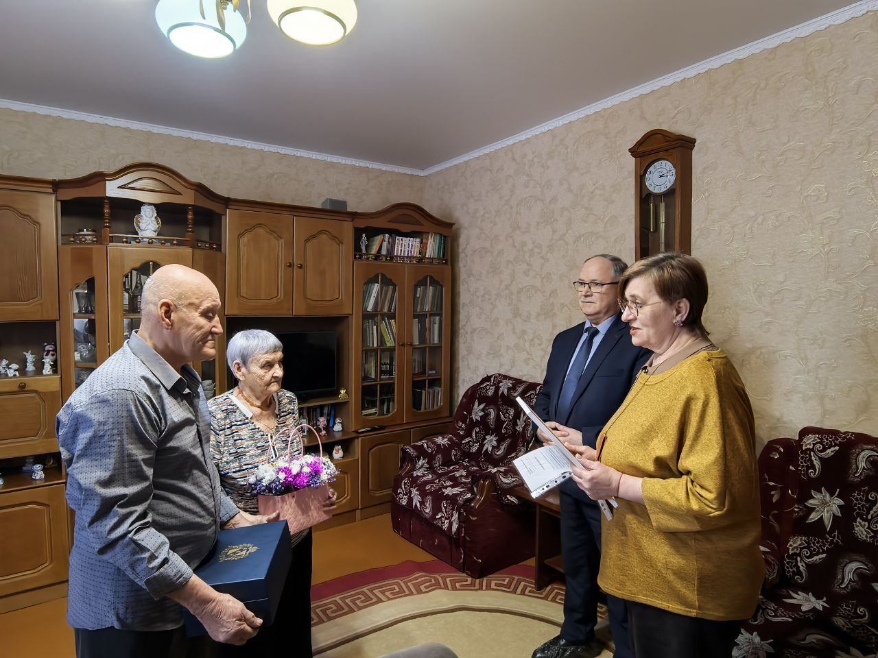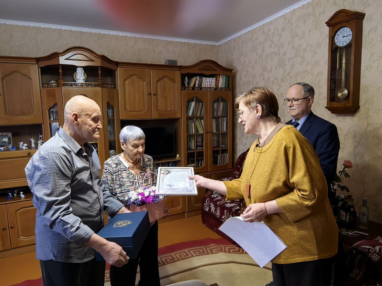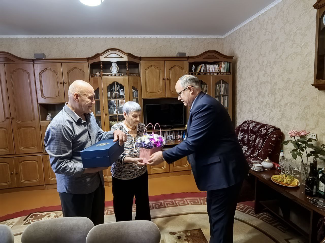 Сегодня от имени Губернатора Курской области Александра Хинштейна я с глубокой признательностью вручил юбилярам замечательный подарочный набор: чашки и блюдца от Императорского фарфорового завода с гербом нашей области и памятной надписью. Также супруги получили персональную поздравительную открытку от главы региона.