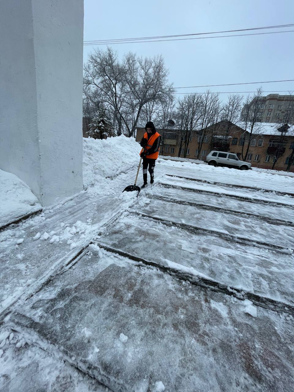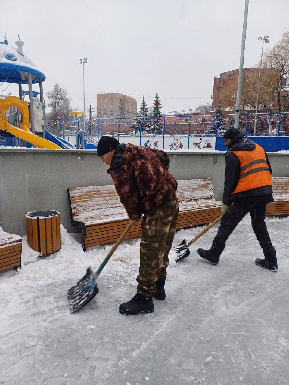 После уборки покрытие обрабатывают противогололедными средствами. Особое внимание уделяют лестницам, дорожкам к лавочкам и пандусам.