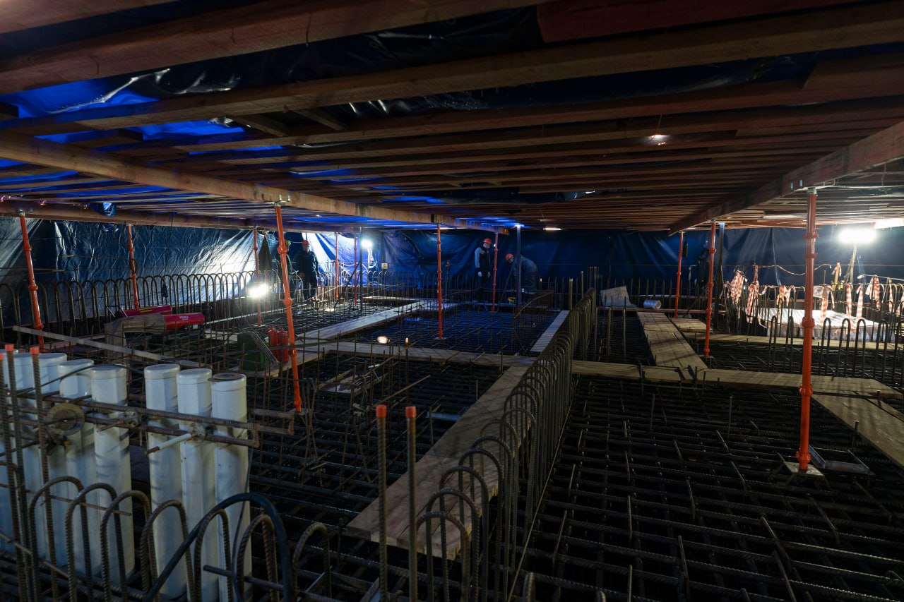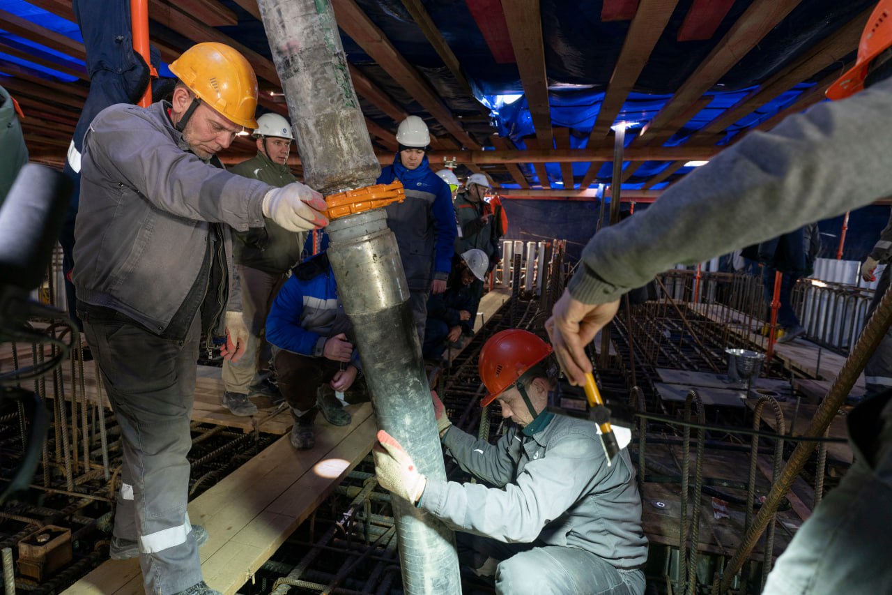 Площадь фундаментной плиты — 5,3 тыс. кв. метров. Она разделена на 6 захваток бетонирования. Объём той, куда пошёл «первый бетон» около 1,9 тыс. куб. метров, заполнялся около суток. А всего в эту фундаментную плиту будет уложено более 15 тыс. кубометров бетона — нерушимая основа будущего курской энергетики. Особенно значимо, что впервые с советских времён мы возвращаемся к поточному методу строительства и применяем его на площадке одного из титанов промышленности.
