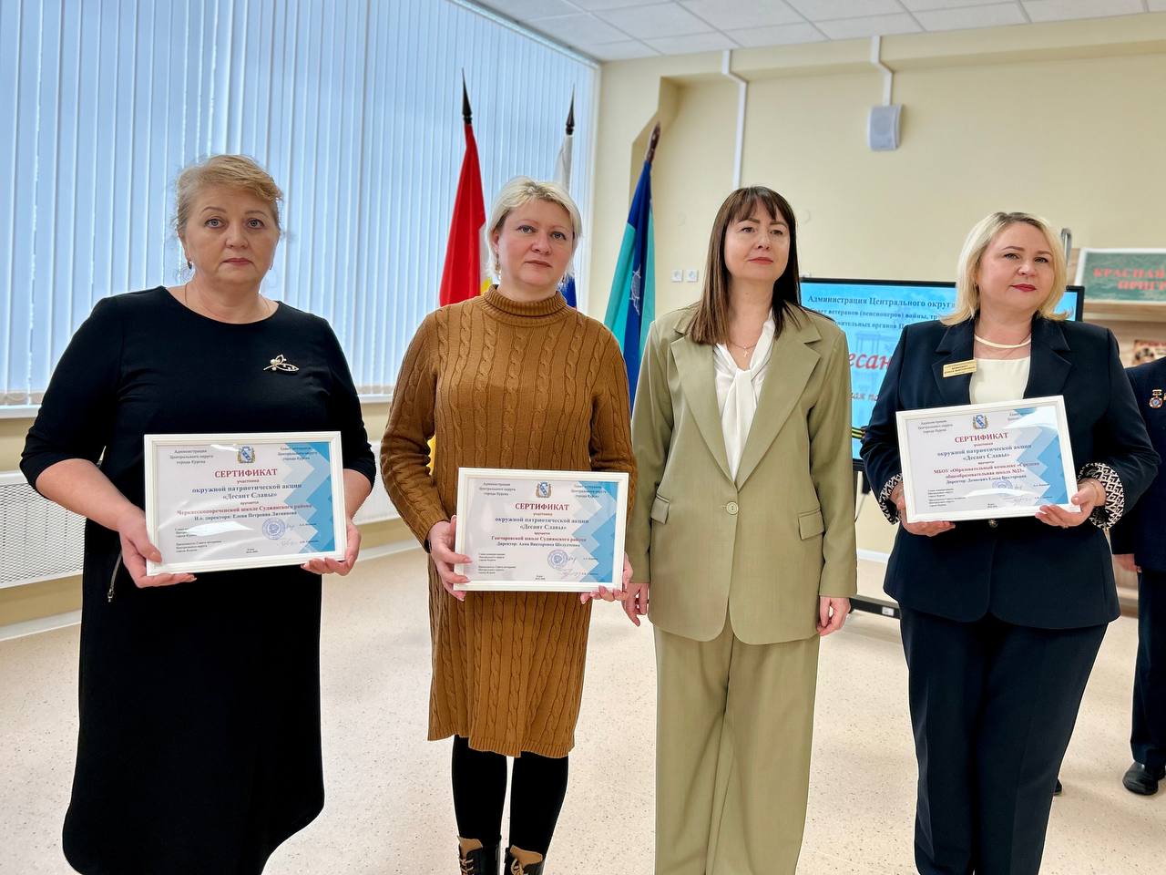 От имени главы администрации округа Андрея Борисова она вручила сертификаты участников окружной акции «Десант Славы» директору школы №23 Елене Демкевич, директору Гончаровской школы Суджанского района Анне Шелудченко и исполняющей обязанности директора Черкасскопореченской школы Суджанского района Елене Литвиновой.