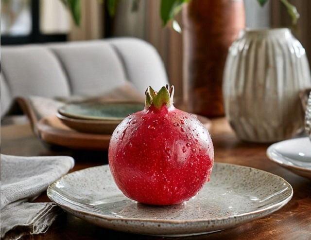 - Разделение: Используя острый нож, аккуратно разрежьте гранат поперек на две половинки. Одна половина должна оставаться с "попкой", а другая с "макушкой".