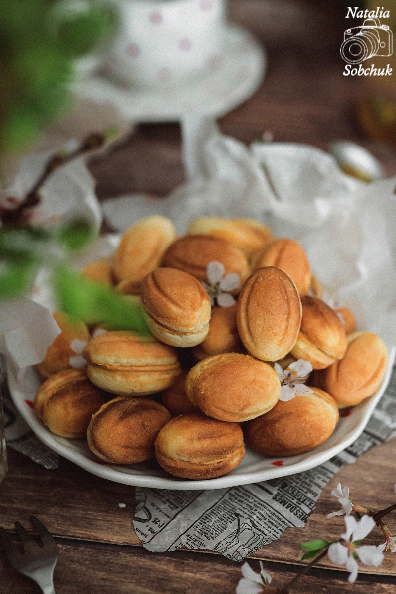 2. Формирование орешков: Из охлаждённого теста сделать шарики, по 8 штук за раз. Разогретый мультипекарь или орешница подготовить для выпекания. Орешки выпекать около 3 минут. Аккуратно обрезать края, наполнить начинкой, соединить половинки.