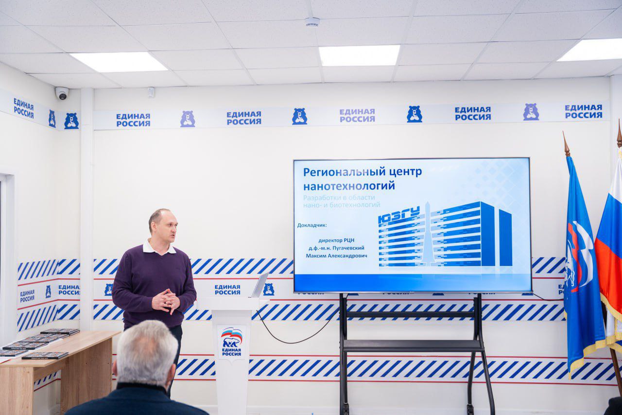 Директор регионального центра нанотехнологий ЮЗГУ Максим Пугачевский представил научные достижения университета. Он рассказал о разработках в области нано- и биотехнологий, включая воздушные гипоаллергенные фильтры, защитные покрытия от радиоактивного излучения и роботизированную установку для уничтожения растительности с помощью СВЧ-излучения.