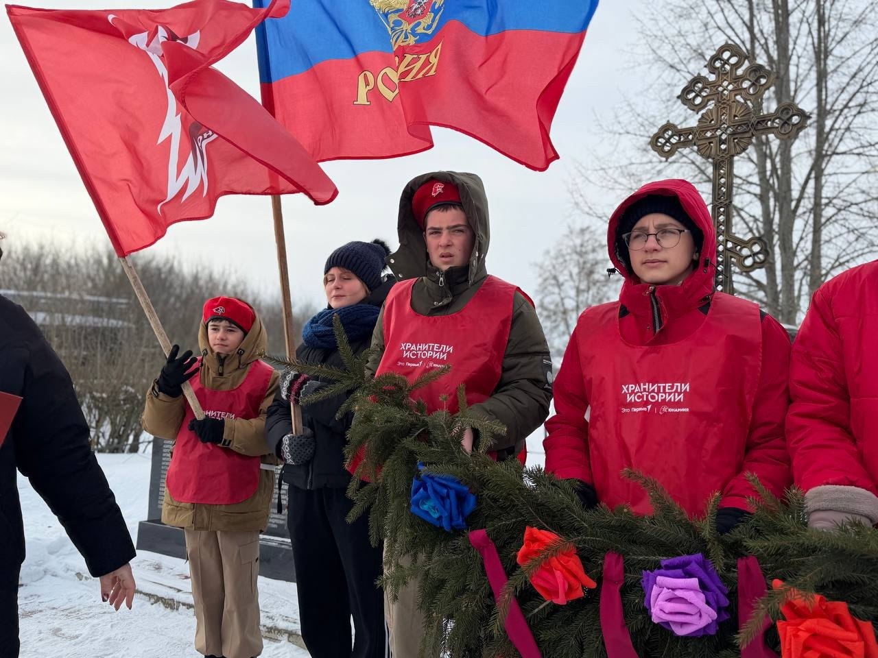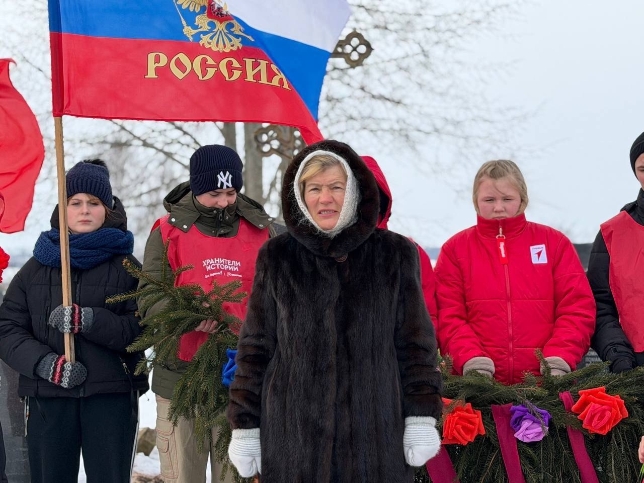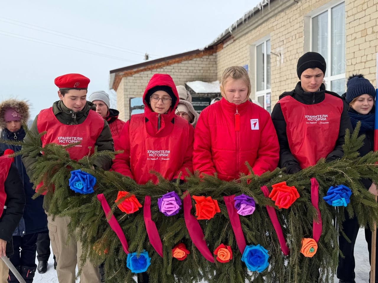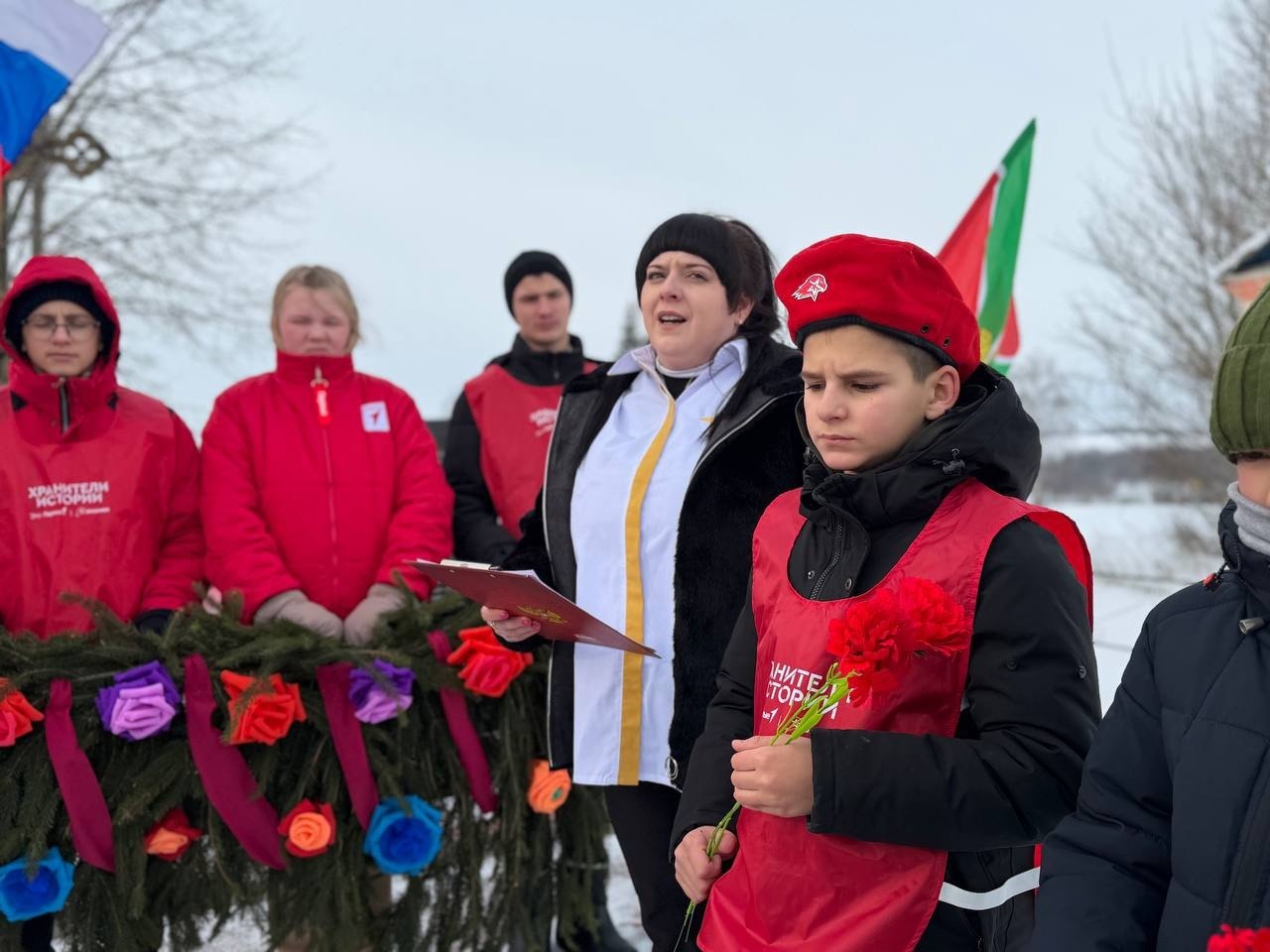 Школьники возложили к мемориалу гирлянду Славы. Трогательно, что эту поделку своими руками сделали работники культуры вместе с ребятами из кружка «Умелые ручки» — память о прошлом жива!