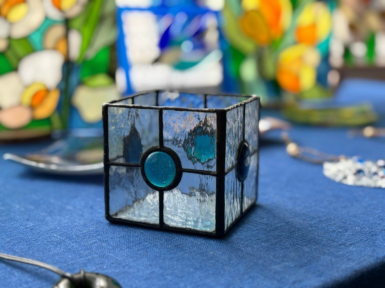 Мастера рассказали гостям о технике Тиффани — чем она отличается от классического витража и почему выполненные таким методом вещи получаются изящными и детализированными. Для наглядности продемонстрировали этапы изготовления витража.