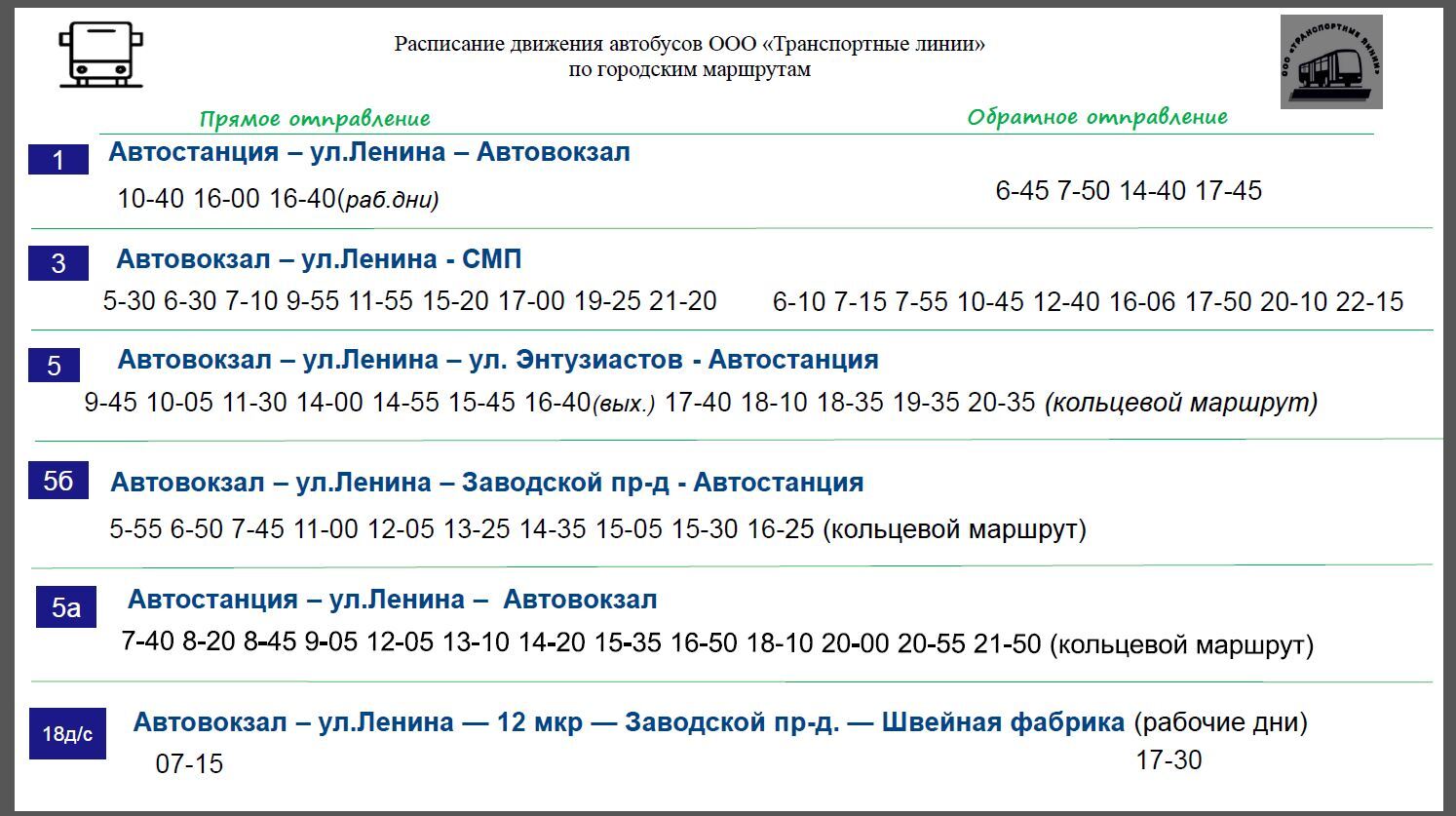 Добавлено в маршрут № 1 время 7:50 (АС10-Ленина-АВ) и в маршрут 5а – 8:25 (АВ-АС10-АВ).