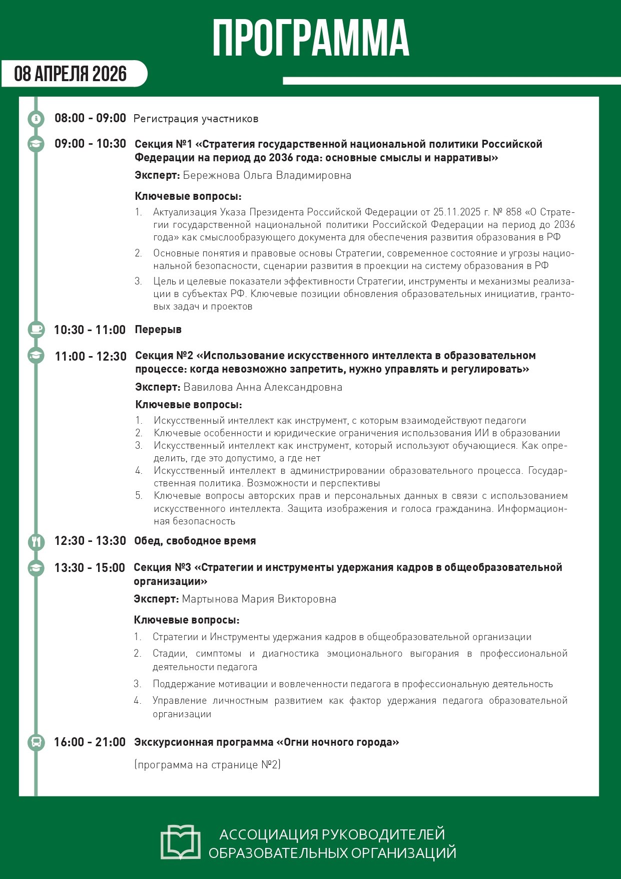 Конференция состоится с 8 по 10 апреля в городе Москва. Участники обсудят стратегии государственной национальной политики РФ, инструменты удержания кадров в общеобразовательной организации, усиление педагогического ресурса школы и многое другое.