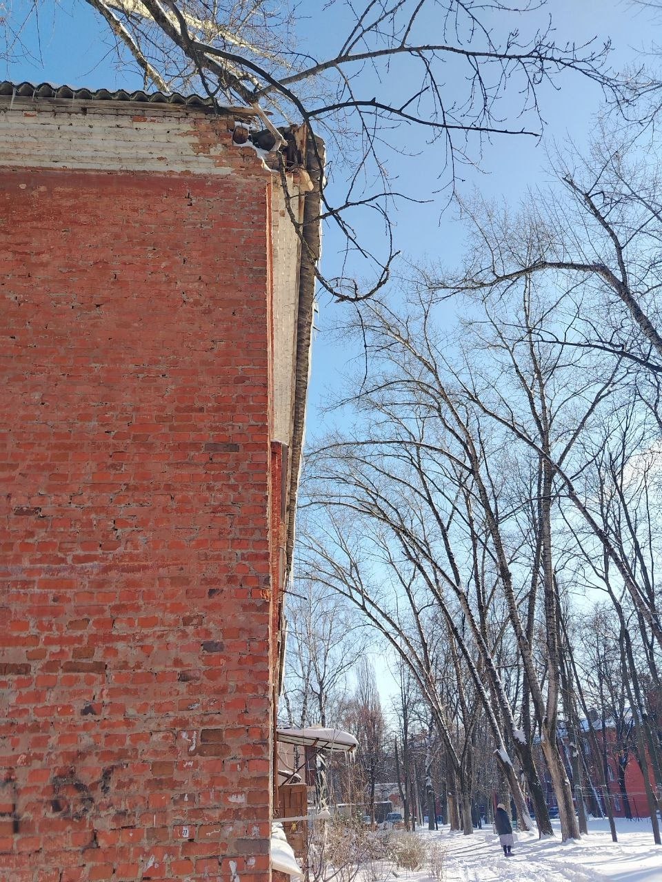 На прошлой неделе рядом с этим общежитием упал обломок от сбитого беспилотника. Из-за взрывной волны разбились окна в подъезде, а кирпичную кладку повело вниз. Довольно опасная ситуация, ведь в доме и до БПЛА фиксировалась угроза обрушения: