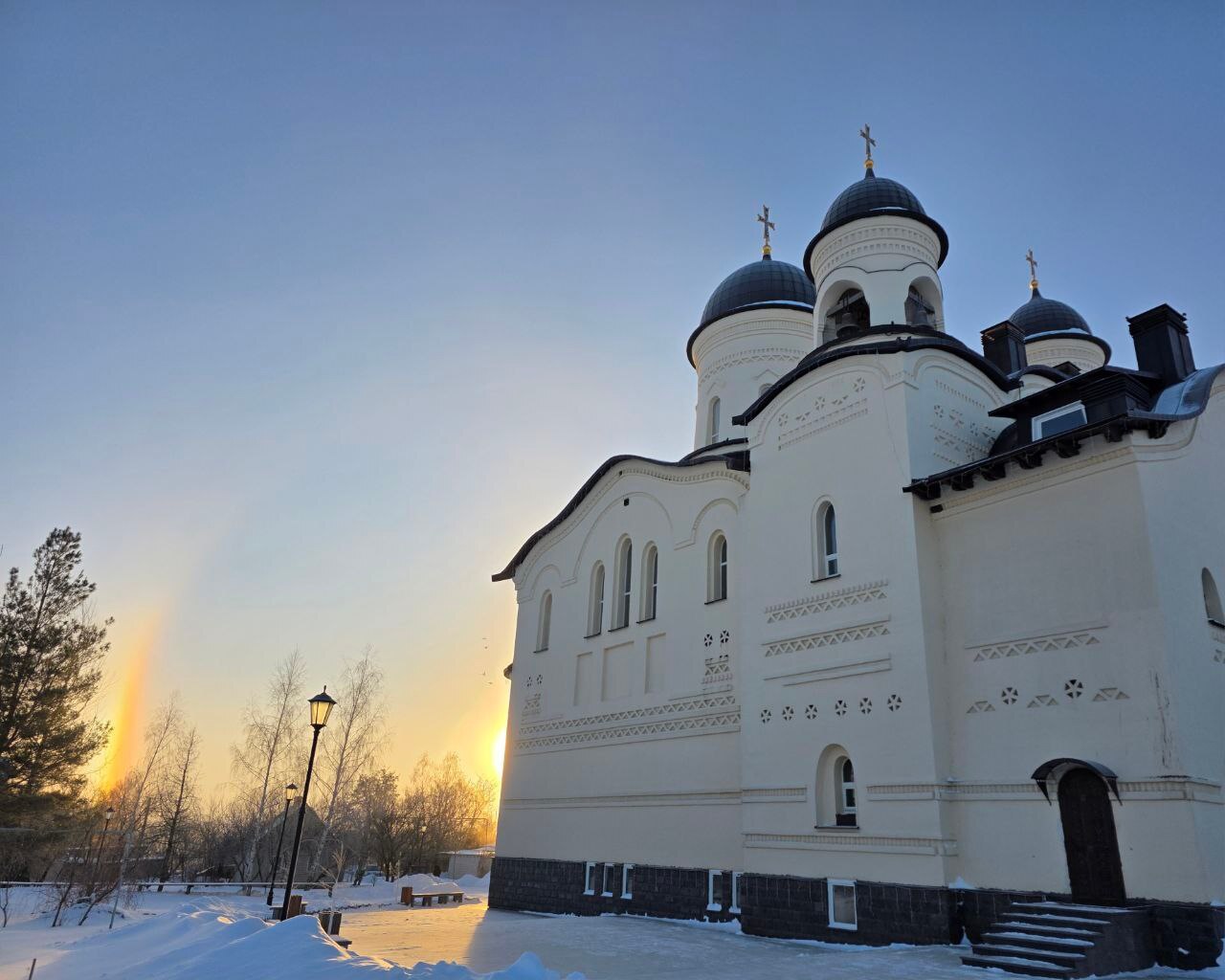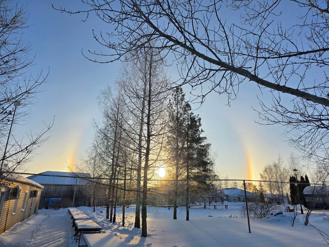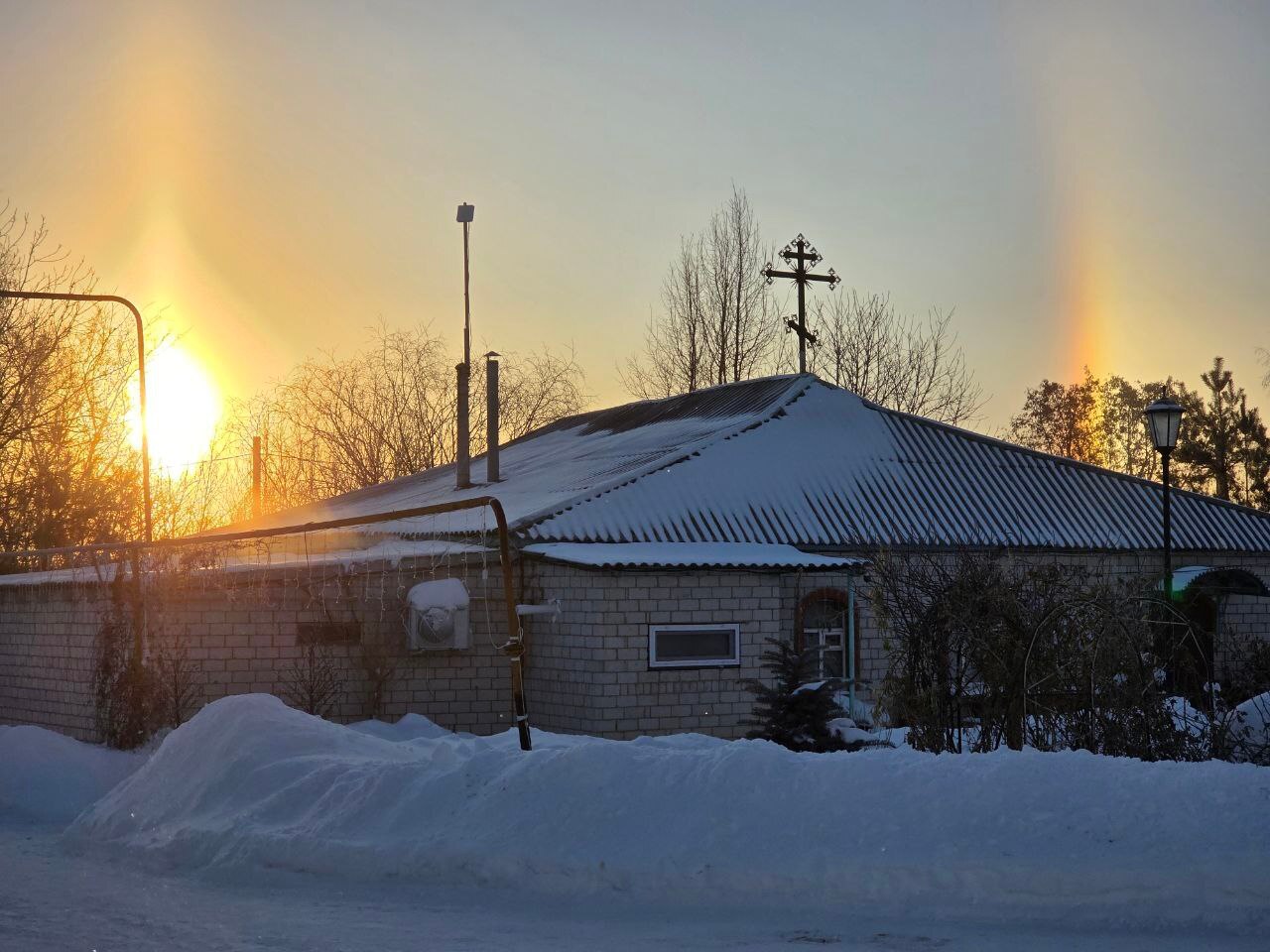 Сегодня над Обителью Покрова Пресвятой Богородицы в деревне Удеревка возникло таинственное сияние: вокруг солнца расцвела прозрачная светящаяся дуга — словно небесный венец.