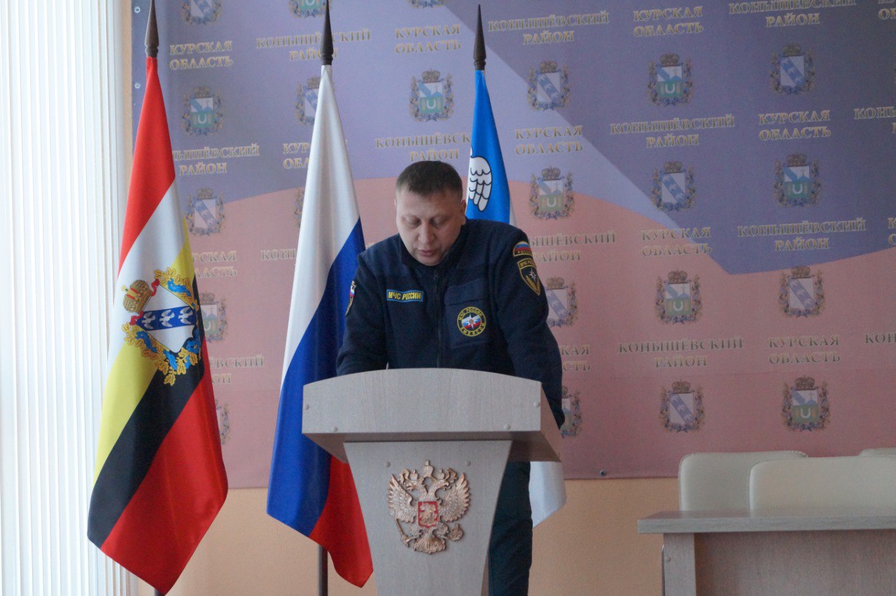 Начальник ОНД и ПР по г. Льгову, Льговскому и Конышевскому районам Владимир Быков выступил с докладом по проводимой работе главами п. Конышевка и сельсоветов. Указано о недостаточности проводимых мероприятий исходя из случаев пожаров с начала 2026 года.