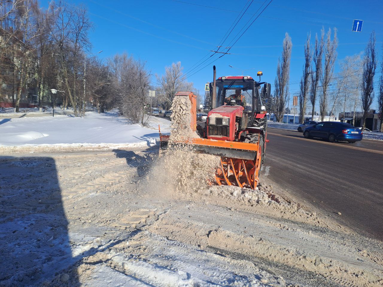 Службы города продолжают наводить порядок в областном центре, убирая снег и лёд с проезжей части и пешеходных зон, а также обрабатывая поверхность песко-соляной смесью.