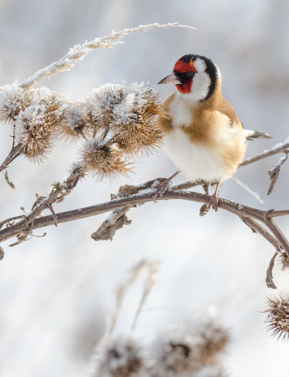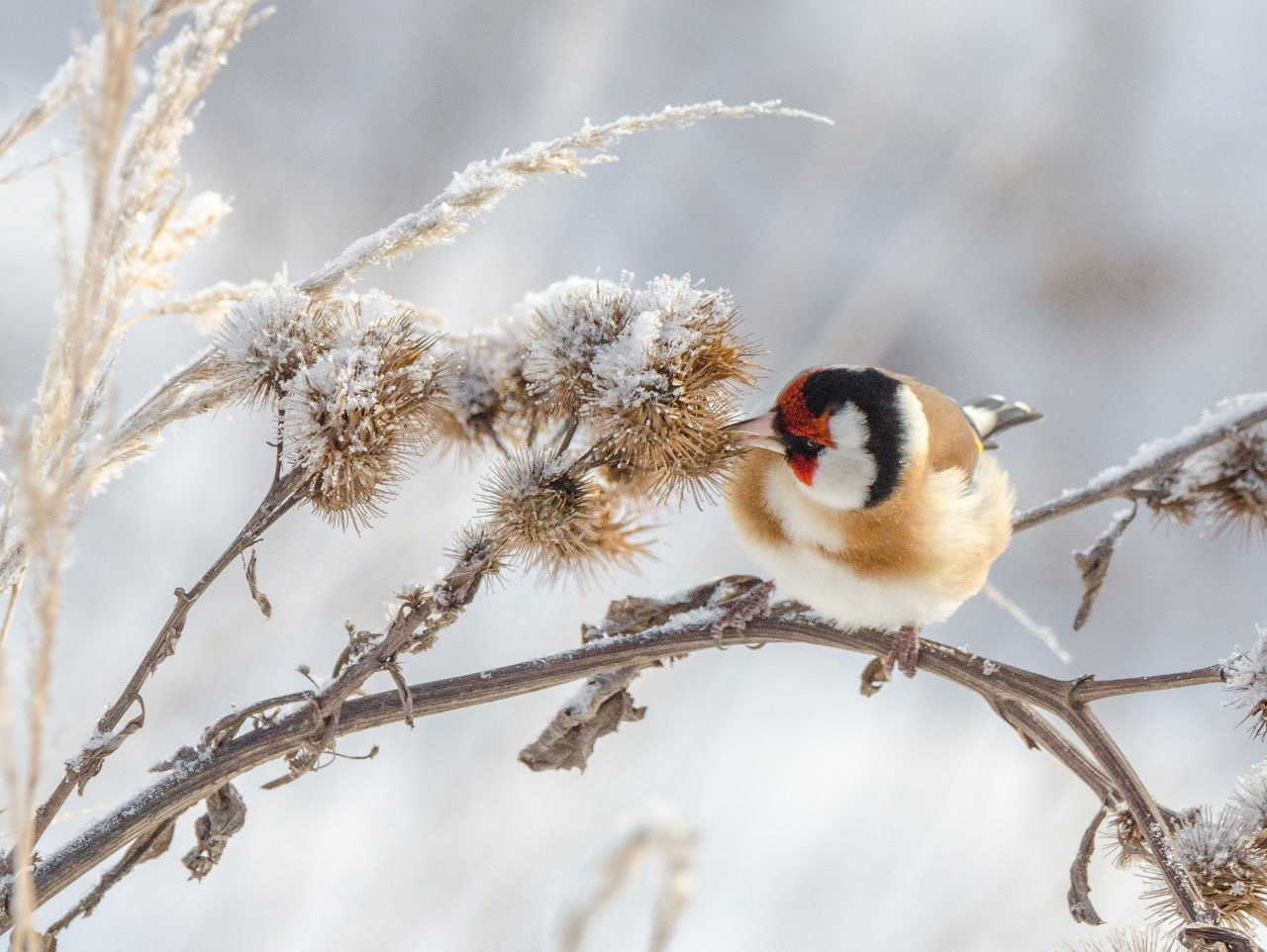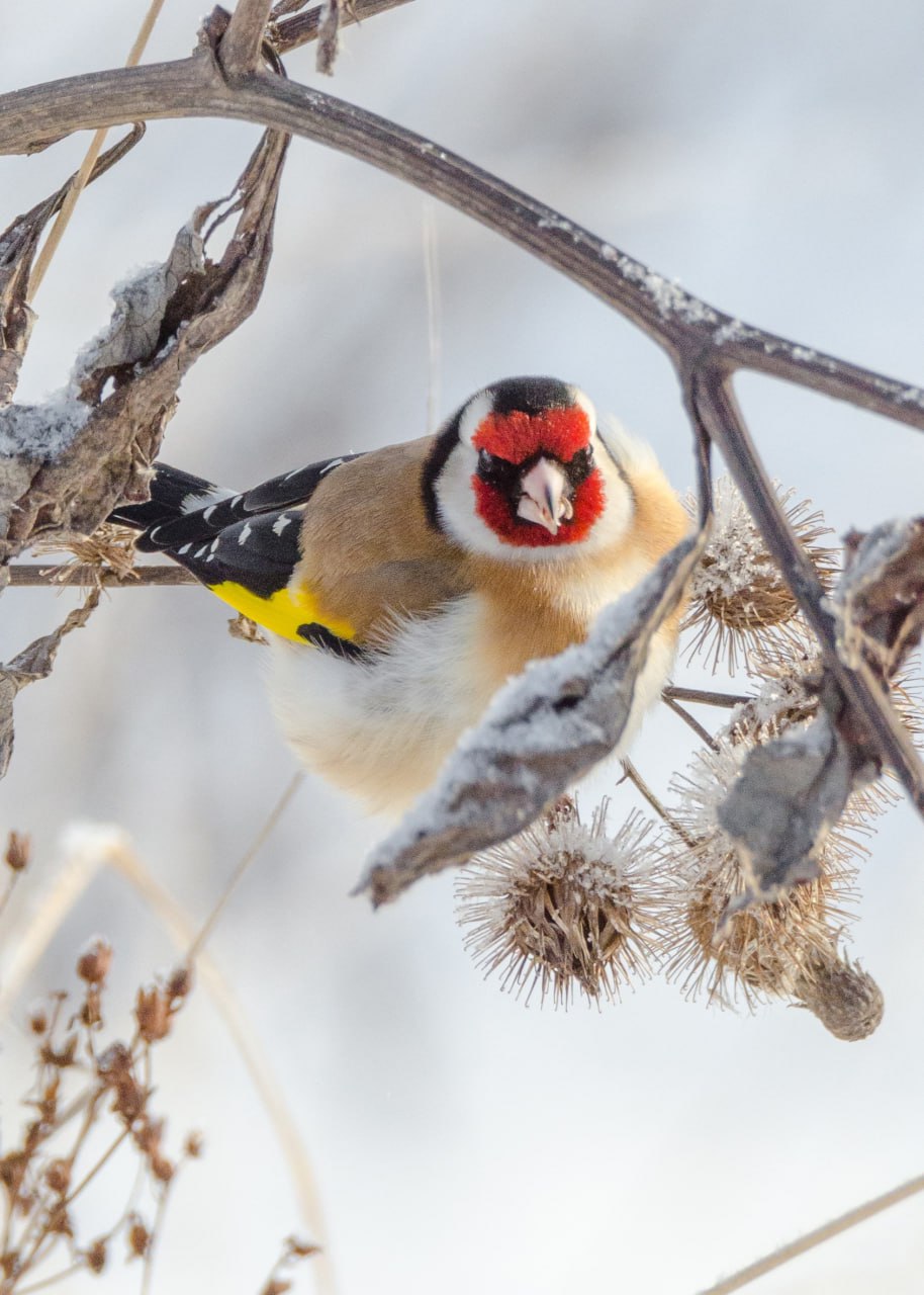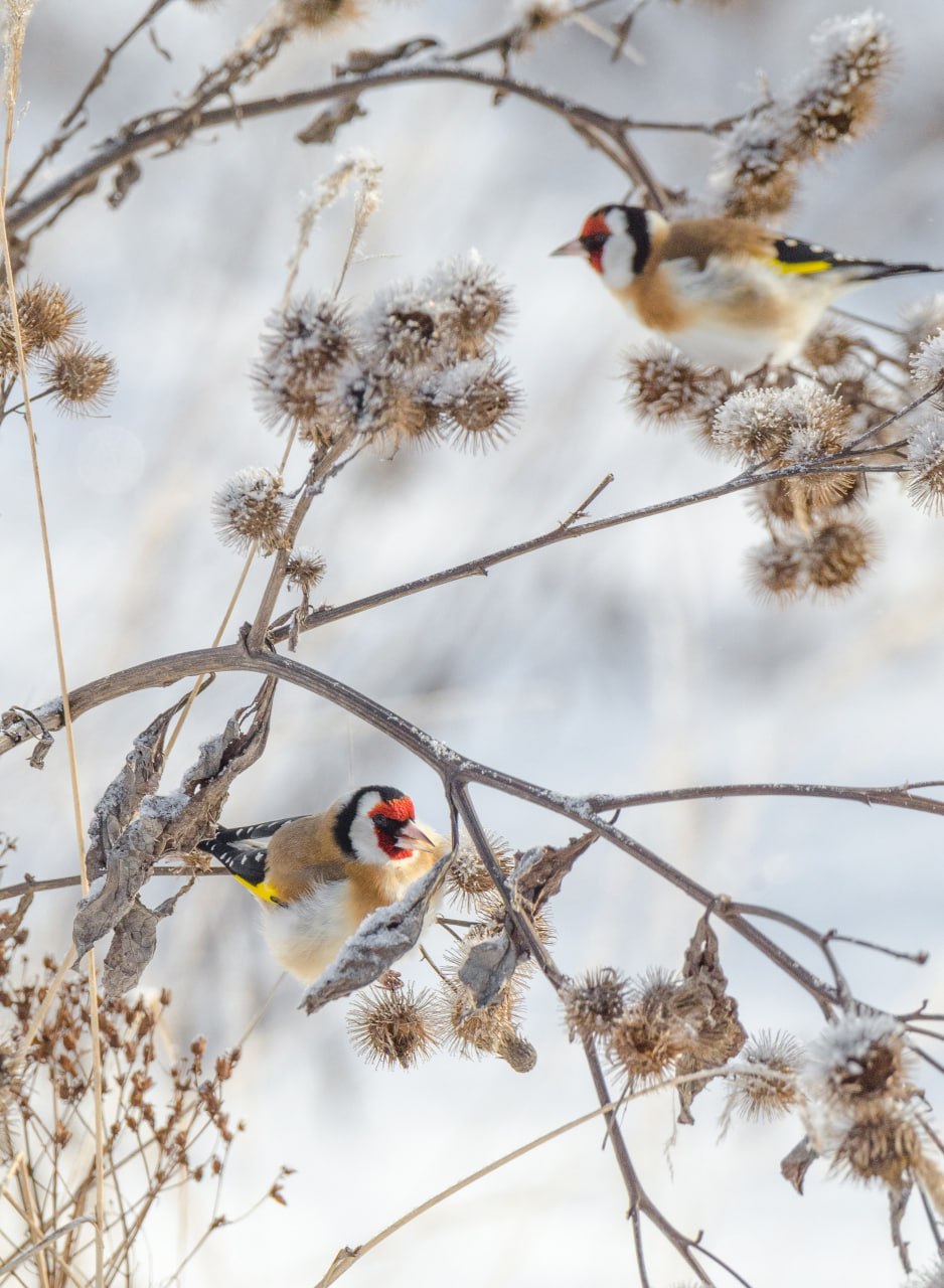 - Во время фотосессии в Железногорском районе, перемещаясь по автомобильной дороге, вдруг заметил на обочине небольшое красное сочное пятно. Снегирь! Быстро остановился, вышел из машины, но в этот момент всеобщий зимний любимец тут же улетел… Немного расстроившись, уже был готов вернуться в автомобиль, но неожиданно для себя заметил не менее красивых пернатых - щеглов, которые сидели на засохшем кусте репейника практически рядом с дорожным полотном,- рассказал он в сообществе "Птицы города Курска.