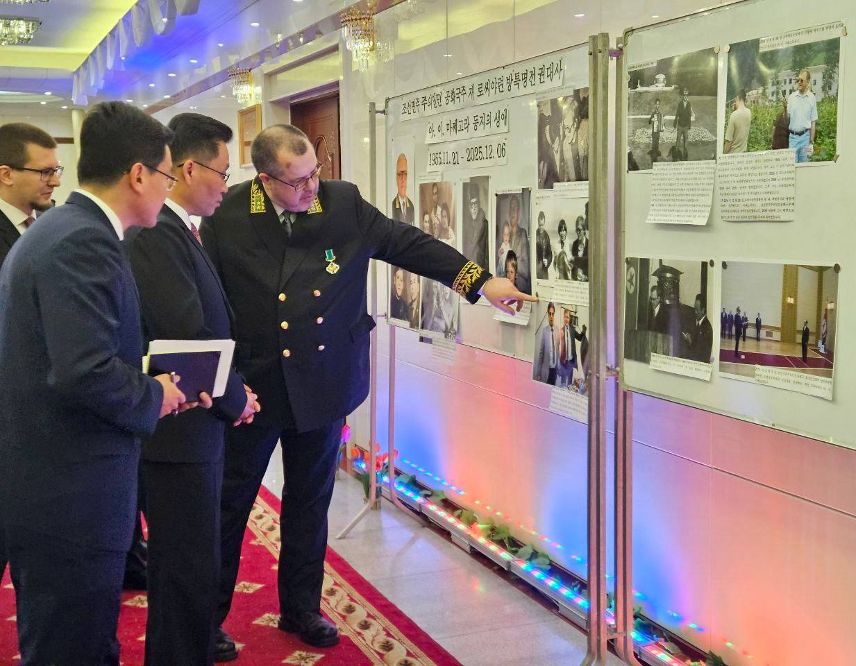 В фойе гости смогли ознакомились с тематической фотовыставкой, посвященной жизненному пути безвременно скончавшегося Посла России А.И.Мацегоры, а также основным событиям российско-корейских отношений в 2025 году.