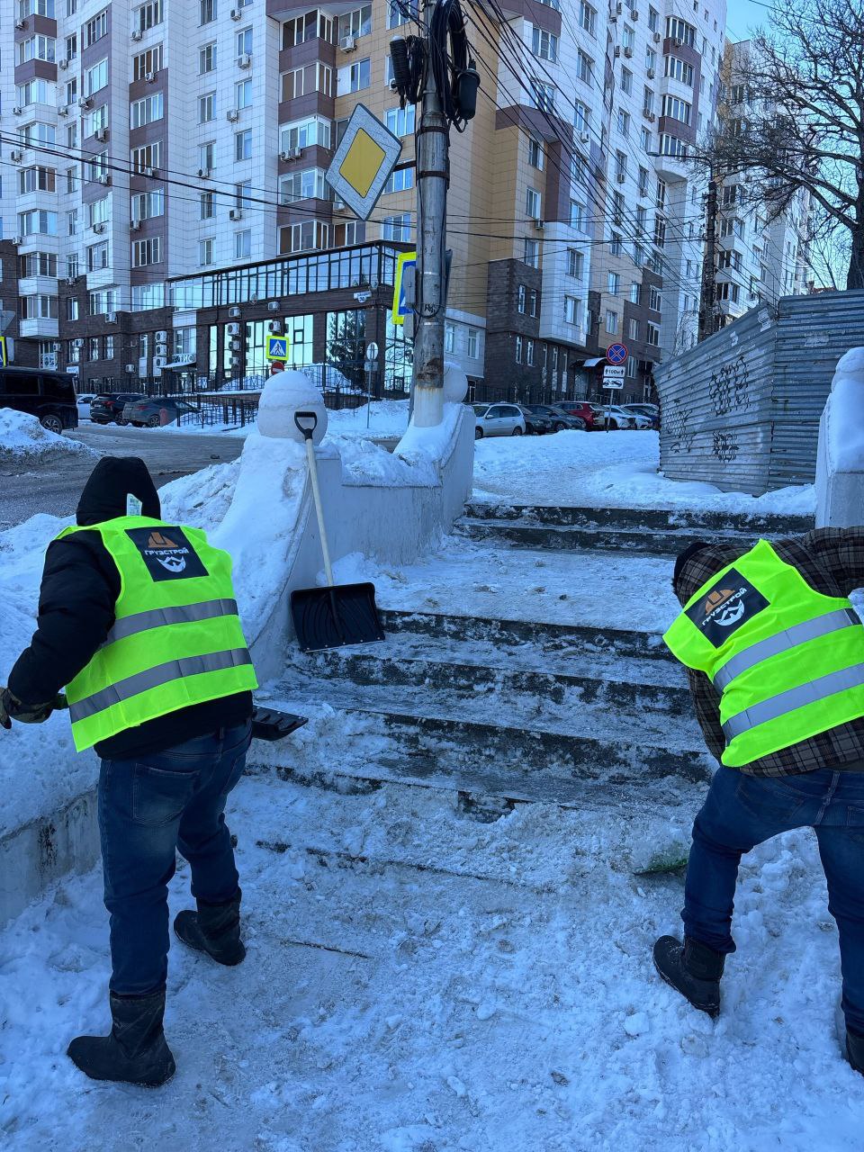 Компания "ГрузСтрой" совместно с "Молодой гвардией" провела уборку лестницы от наледи и снега на улице Мирной.