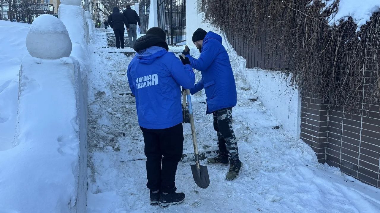 Уборку лестницы от наледи и снега на улице Мирной провела компания «ГрузСтрой» совместно с «Молодой гвардией».