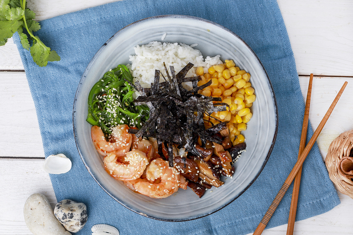 Шаг 4: Нарежьте нори соломкой. В миске для подачи выложите рис, затем по кругу кукурузу, грибы, креветки и салат чука. В центр положите нори, посыпьте кунжутом и подавайте к столу.
