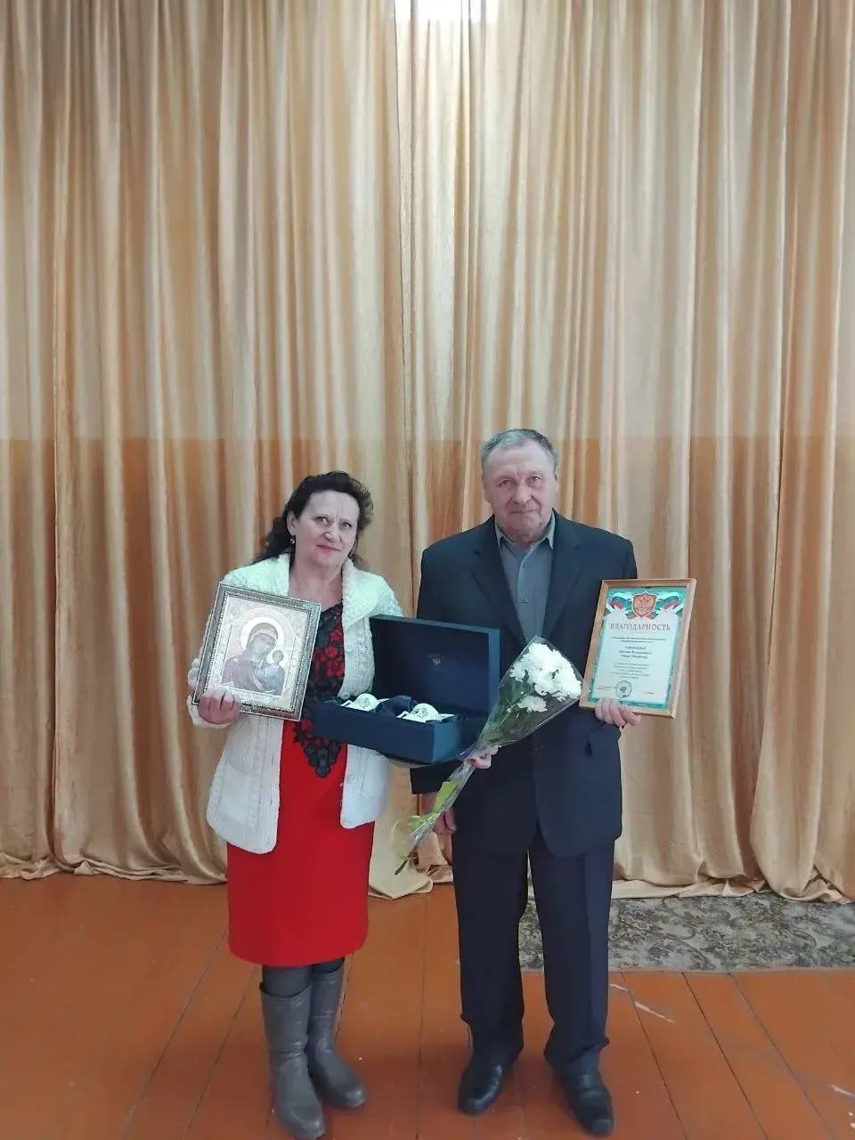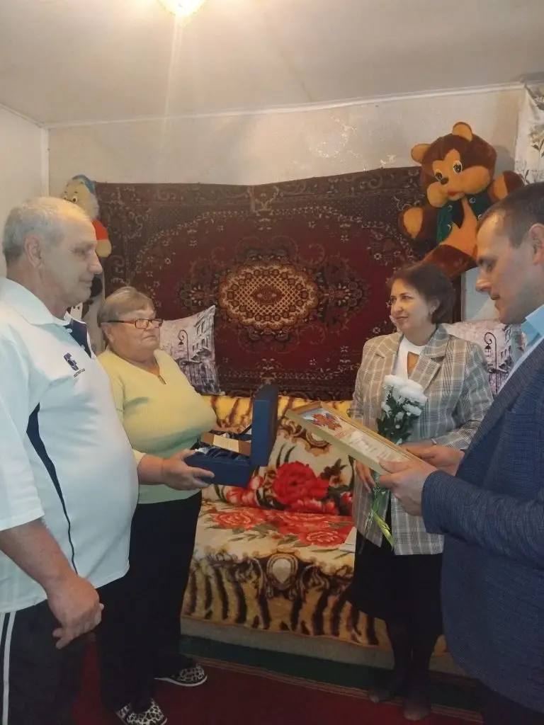 В теплой и торжественной обстановке исполняющий обязанности заместителя Главы Администрации Пристенского района А.Н. Берлизев и начальник отдела ЗАГС Н.Н. Смородина поздравили юбиляров, вручив им подарки от Губернатора и от администрации района.
