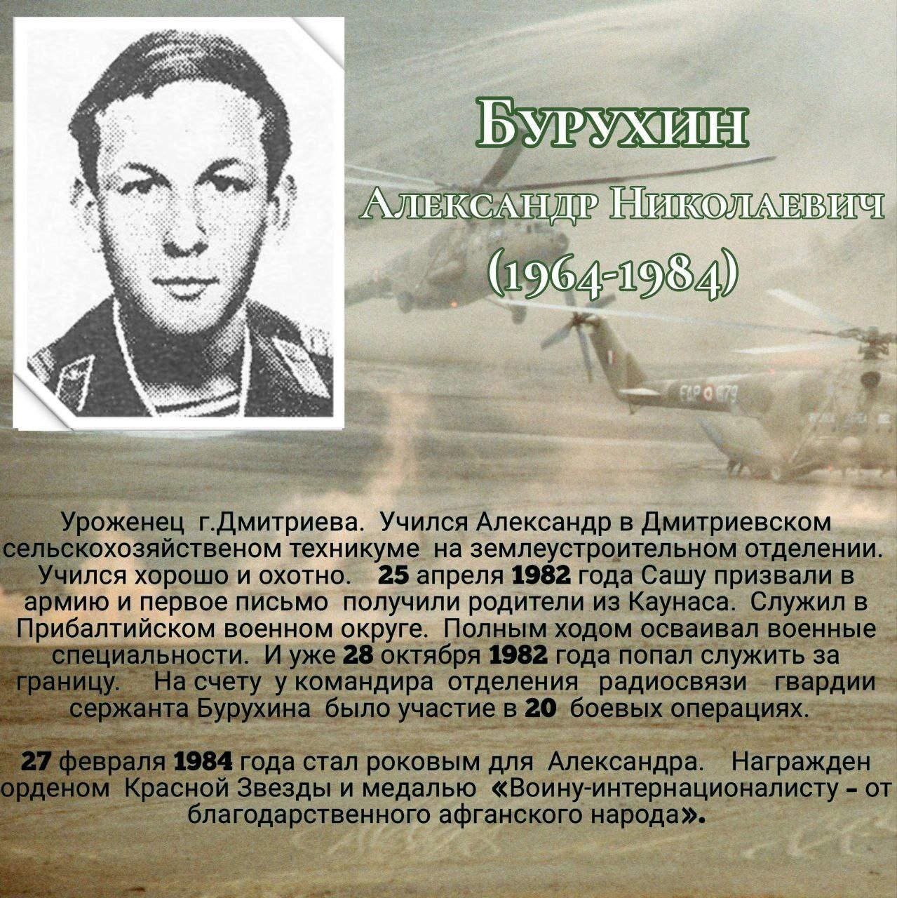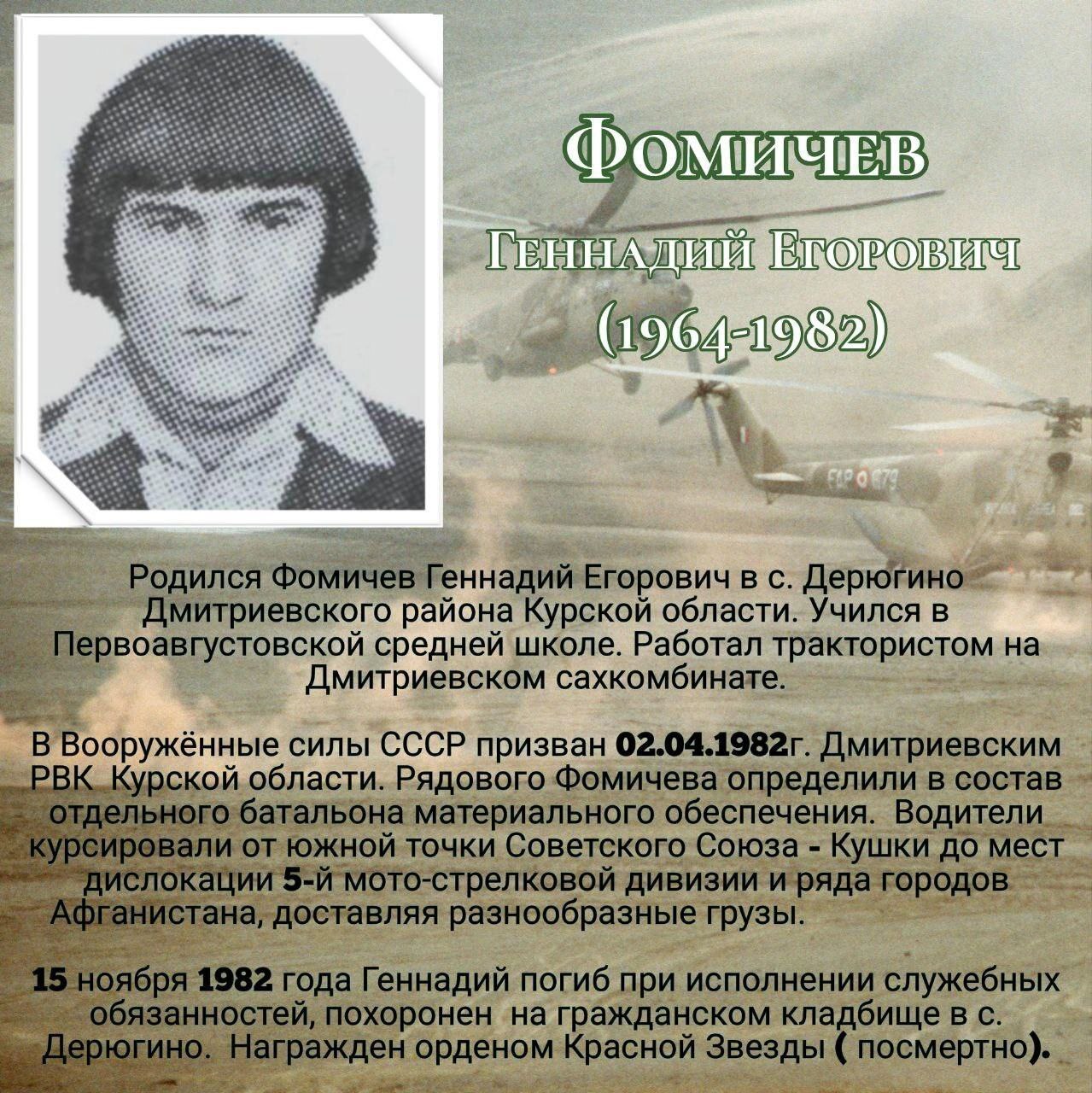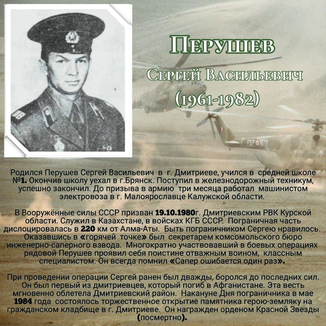 Пять наших земляков-дмитриевцев не вернулись домой с этой жестокой войны. Все они честно и до конца выполнили свой воинский долг. Афганцы – настоящие солдаты в самом высоком значении этого слова. Честь им, слава и низкий поклон.