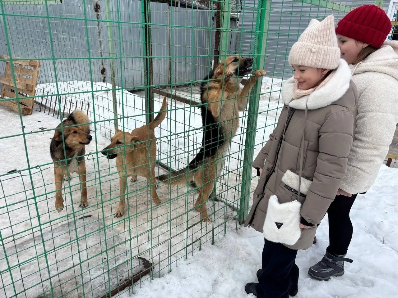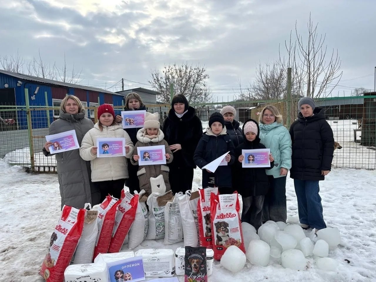 Юные добровольцы вместе со взрослыми посетили приют для бездомных животных в Курске «Добрый город» и передали корм для собак.