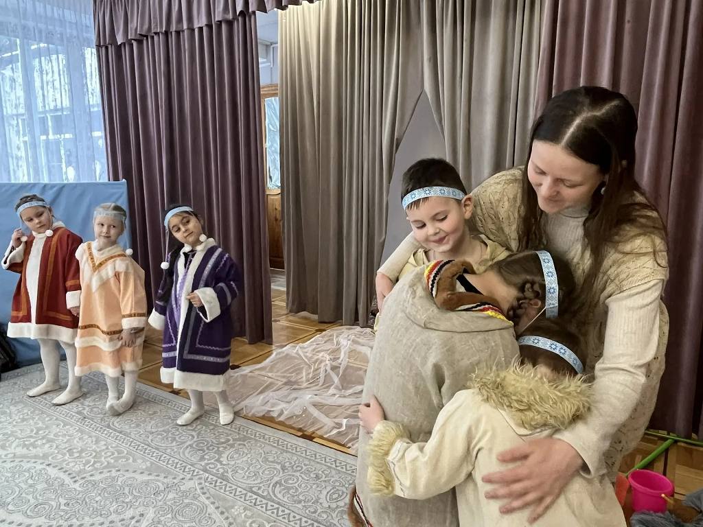 Дети вместе с родителями и педагогами, используя яркие костюмы и декорации, инсценировали чукотские, саамские, ненецкие и другие сказки.