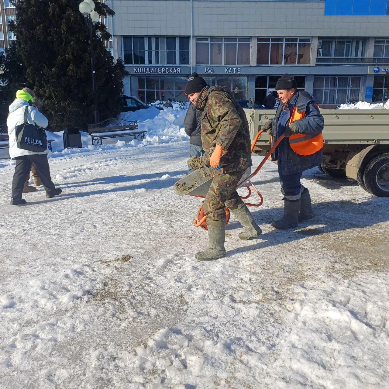 Сотрудники подрядной организации посыпают песко-соляной смесью и реагентами дороги и пешеходные зоны, уделяя особое внимание транзитным участкам и склонам.