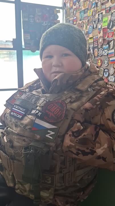 Мальчик живет прямо у дороги, по которой наши войска едут на фронт. Он приветствует наших ребят, желает удачи, а те отвечают сувенирами — так у Сережи собралась огромная коллекция флагов (уже больше 200) и шевронов.
