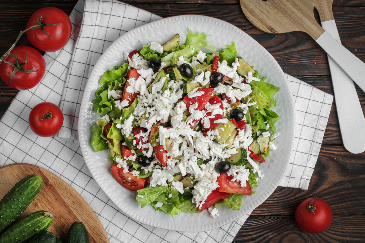 Шаг 2: Нарежьте помидоры и огурцы крупными кусочками, а перец гриль – соломкой. Листья салата аккуратно порвите руками, а брынзу натрите на крупной терке. В глубокой миске объедините нарезанные огурцы, помидоры, маслины и перец гриль, а затем добавьте заправку. Перемешайте все ингредиенты. На тарелку уложите листья салата, сверху выложите овощную смесь и посыпьте натертой брынзой. Подавайте сразу же, чтобы сохранить свежесть и вкус летних овощей.