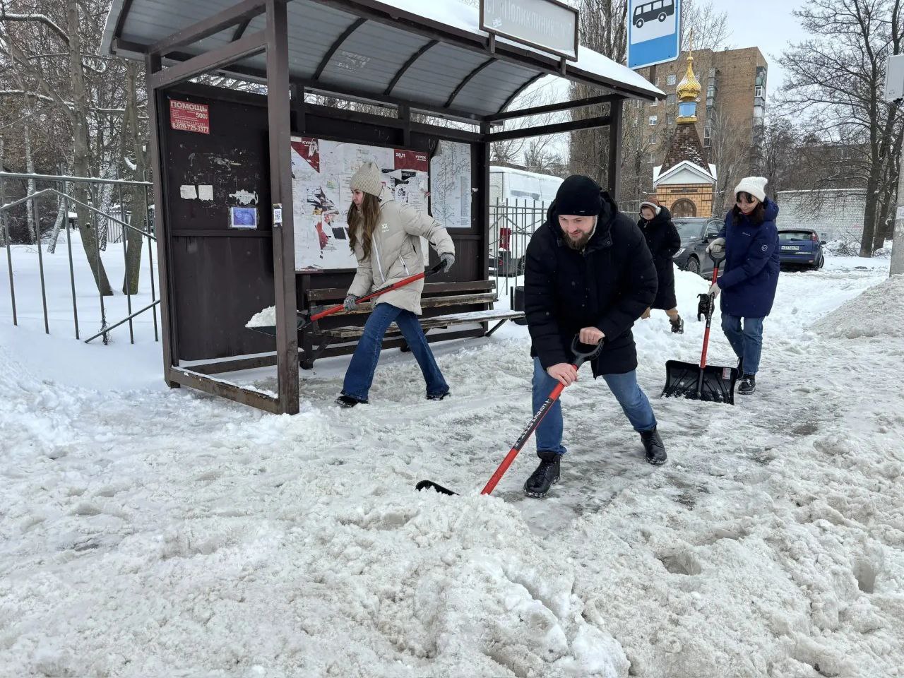 Управление информации и печати администрации города параллельно чистит остановку "Поликлиника №7".