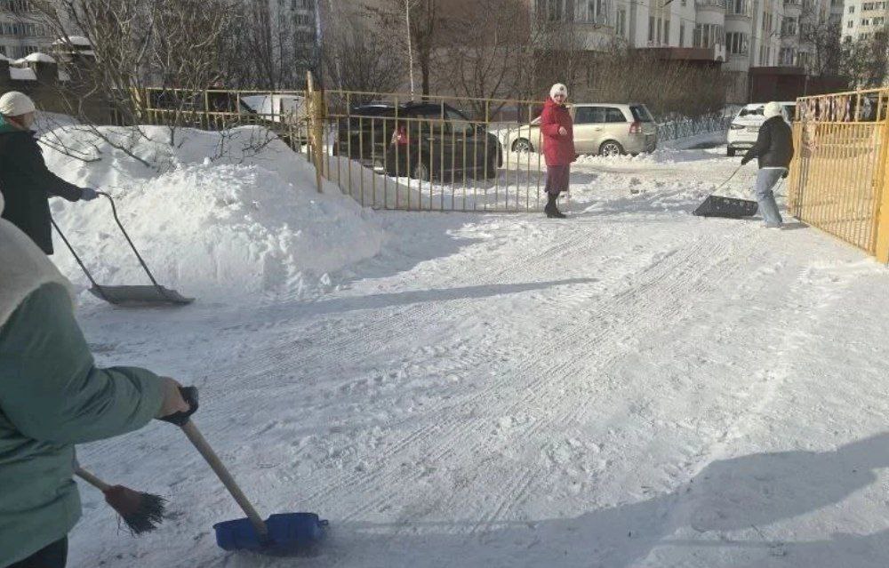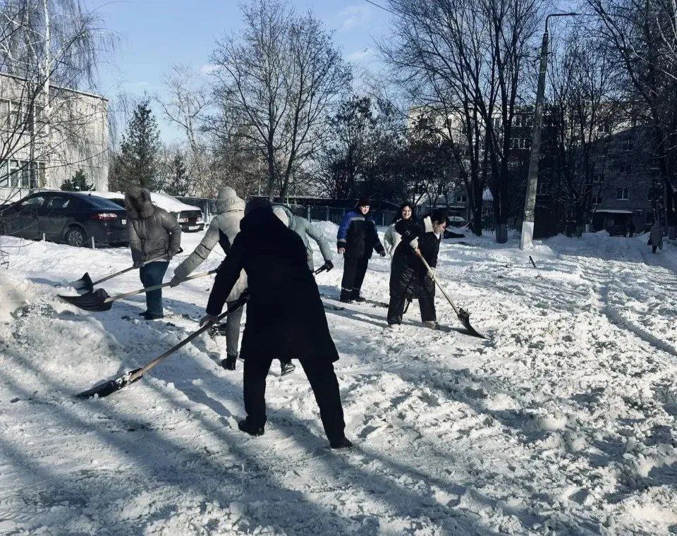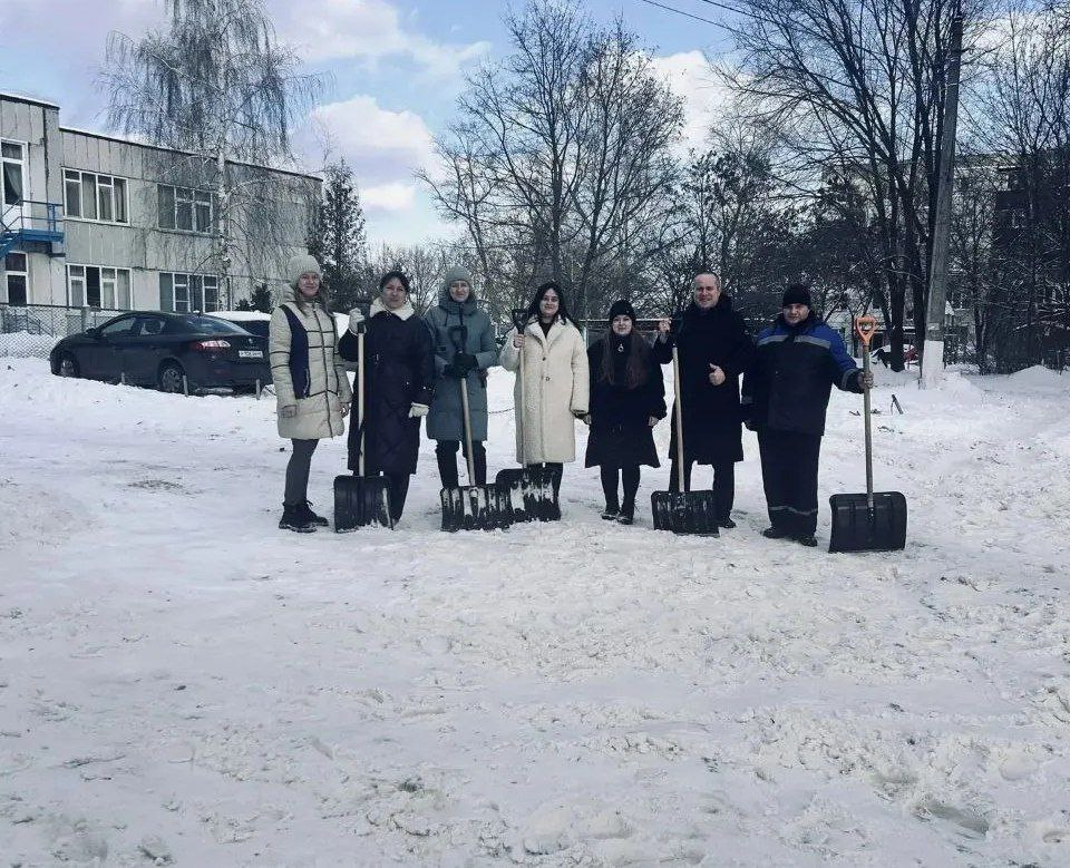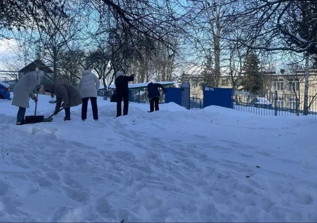Воспитатели детских садов убирают территорию, дорожки и подходы к зданиям.