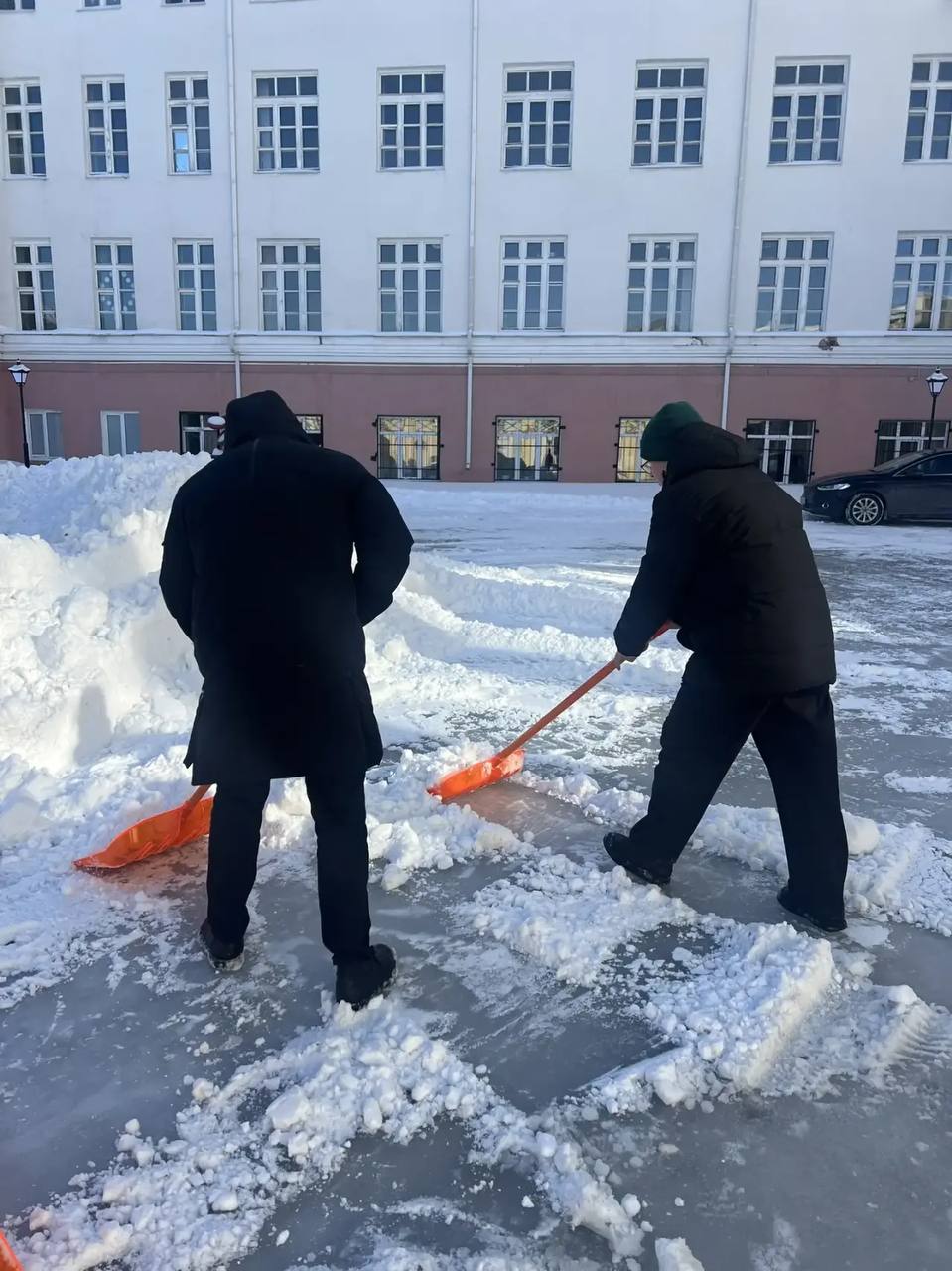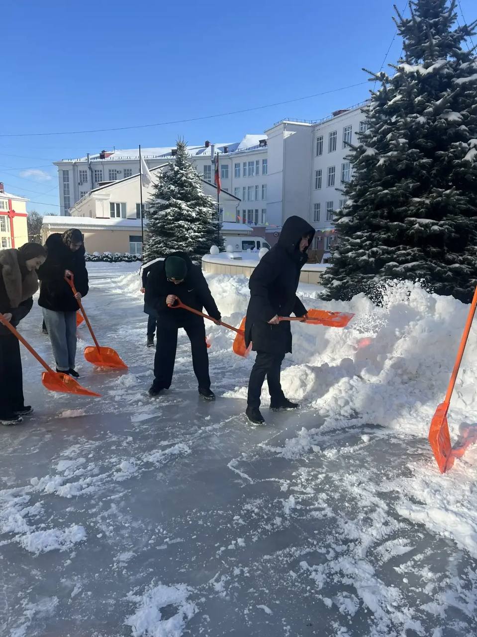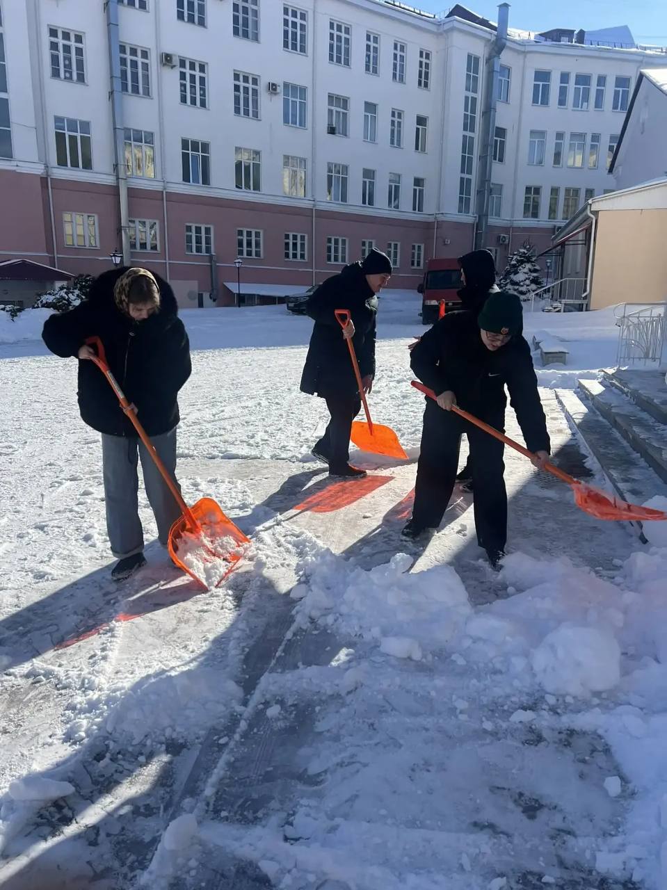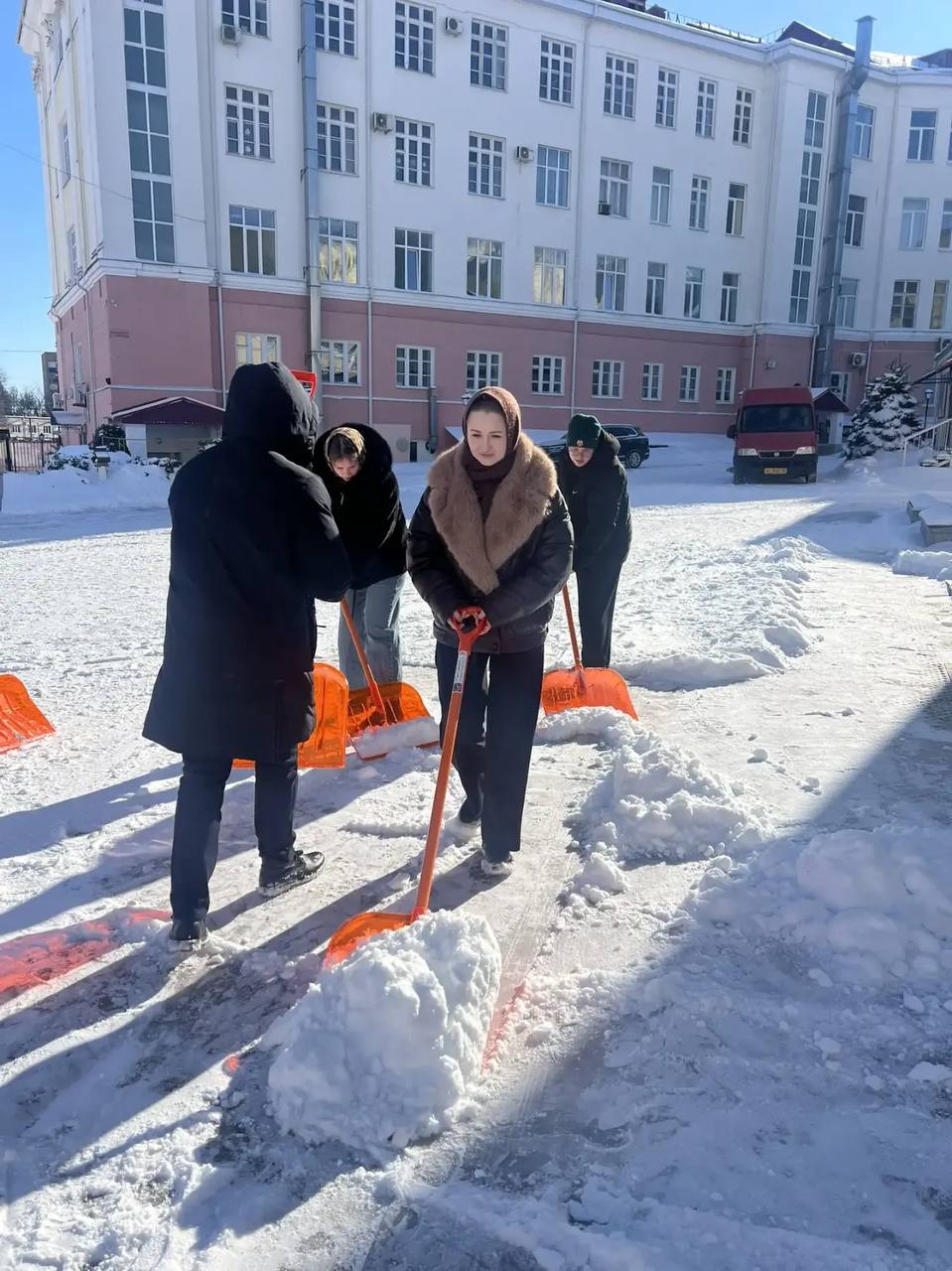 Вооружившись лопатами и хорошим настроением, студенты расчищали пешеходные зоны и территорию вуза. Работа нашлась для всех: кто-то убирал свежий снег, кто-то боролся с наледью.