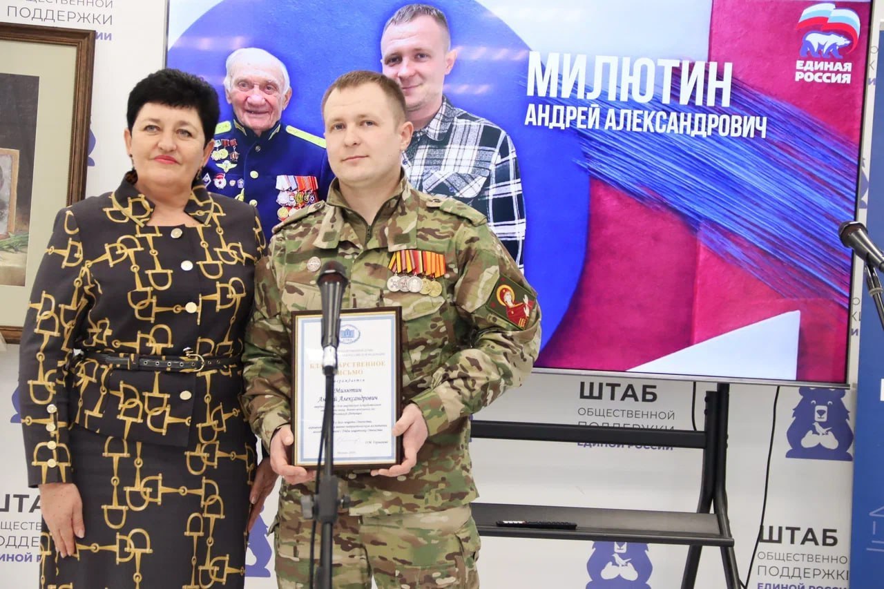 Депутат вручила благодарственное письмо участнику СВО Андрею Милютину. Вкратце напомнив о его подвиге.
