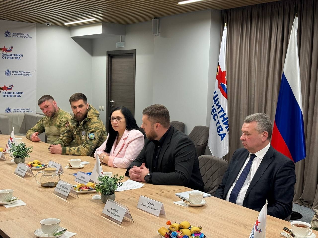 В преддверии Дня защитника Отечества в региональном филиале фонда «Защитники Отечества» заместитель губернатора Курской области Евгений Лобов и руководитель курского филиала Татьяна Банникова встретились с ветеранами специальной военной операции.