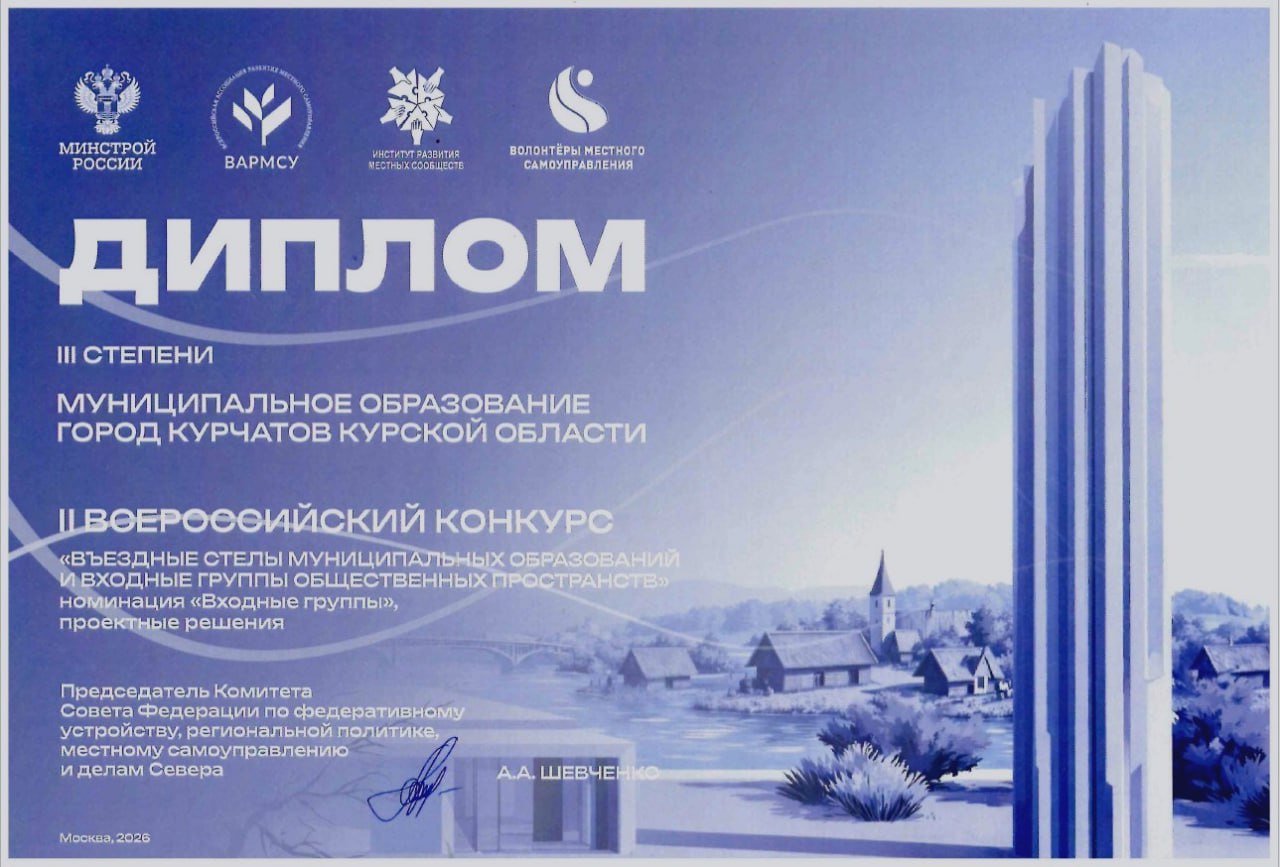 По итогам II Всероссийского конкурса «Въездные стелы муниципальных образований и входные группы общественных пространств» город Курчатов, единственный из малых городов России, получил два Диплома Победителя!